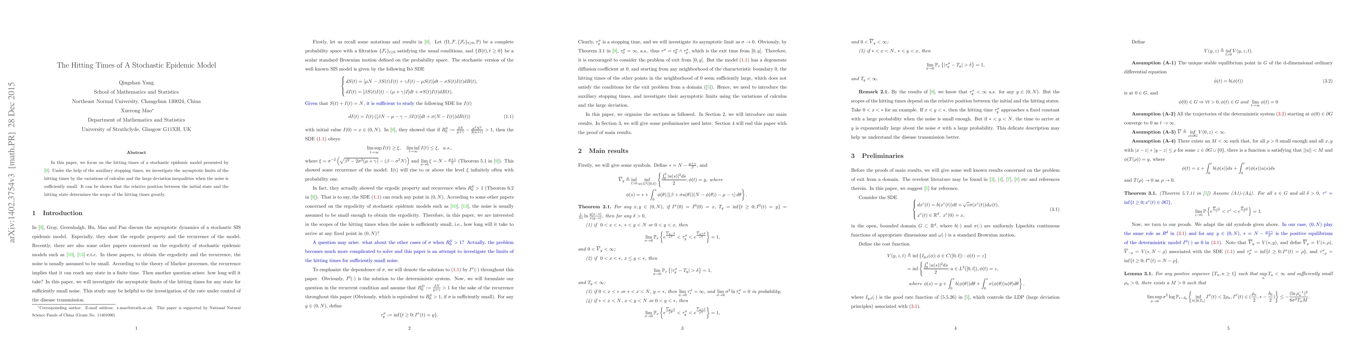 This paper examines the hitting times in a stochastic epidemic model by \cite{Gray}, using auxiliary stopping times and large deviation inequalities to analyze the asymptotic limits when noise is minimal. The study reveals that the initial state's relative position significantly influences the range of hitting times.