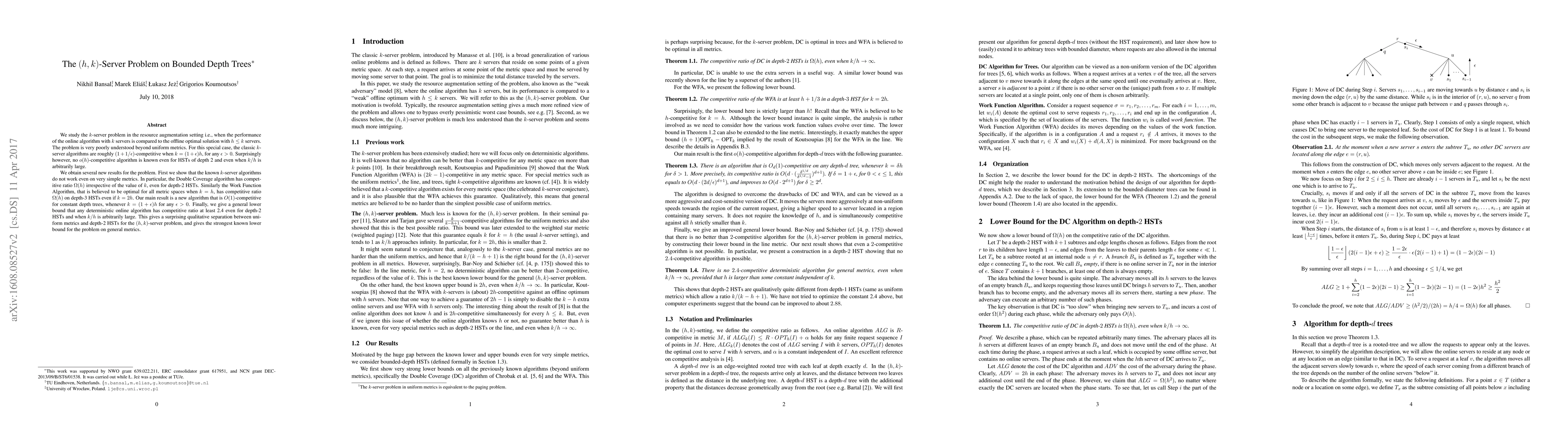 This paper investigates the $(h,k)$-server problem on bounded depth trees, focusing on the competitive ratio of online algorithms compared to offline optimal solutions. The authors demonstrate that existing $k$-server algorithms fail on simple metrics, especially for depth-2 and depth-3 hierarchically semi-structured trees (HSTs). The main contribution is a new $O(1)$-competitive algorithm for constant depth trees under specific conditions, and a lower bound showing that no deterministic online algorithm can achieve better than a 2.4 competitive ratio for depth-2 HSTs.
