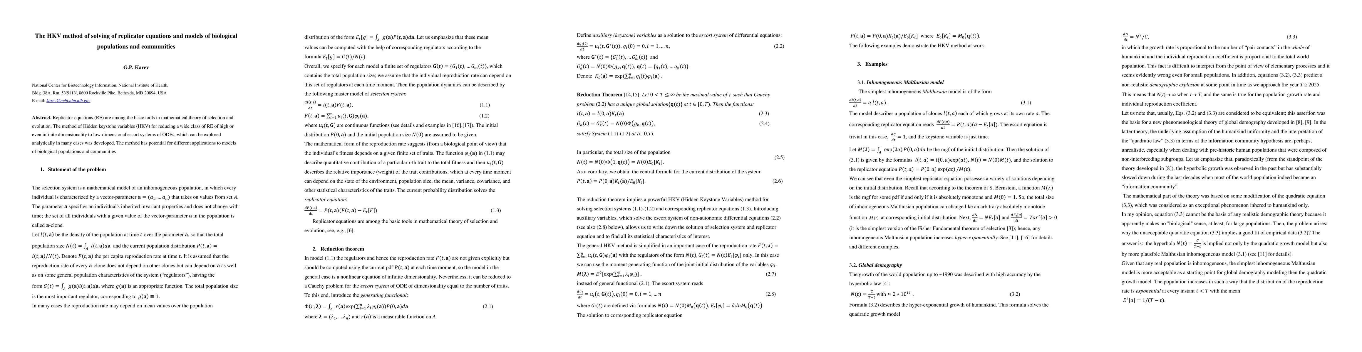 The HKV method simplifies high-dimensional replicator equations into low-dimensional ODEs, facilitating analytical exploration and application to biological population and community models. This approach enhances the understanding of evolutionary dynamics in complex systems.
