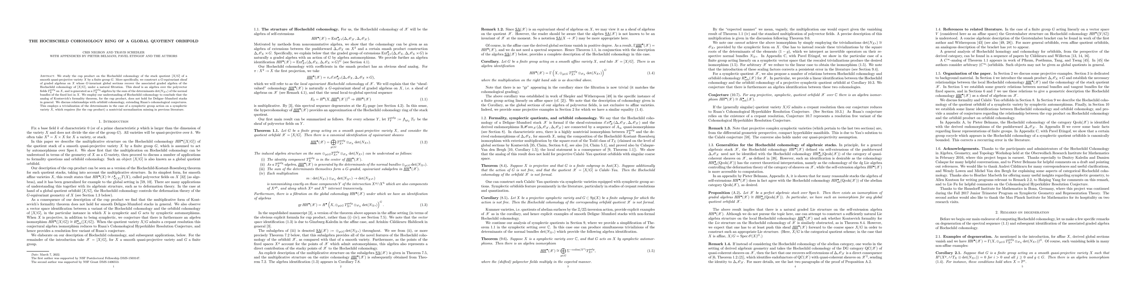 The paper investigates the cup product structure in the Hochschild cohomology of the global quotient orbifold [X/G], constructing a G-equivariant sheaf of graded algebras on X. It concludes that the cup product does not satisfy Kontsevich's formality theorem for Deligne--Mumford stacks and extends Ruan's cohomological conjectures with a novel normalization technique for symplectic actions.