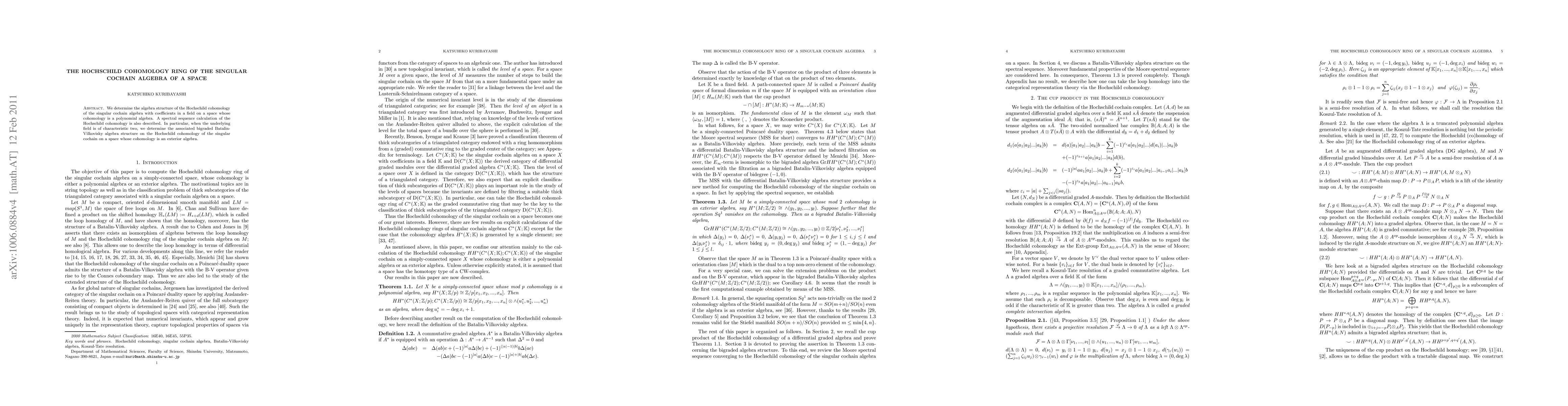 Summary: This paper determines the algebra structure of the Hochschild cohomology of singular cochains on a space with polynomial cohomology and utilizes spectral sequences for calculations. Special attention is given to the Batalin-Vilkovisky algebra structure when the field has characteristic two for spaces with exterior algebra cohomology.
