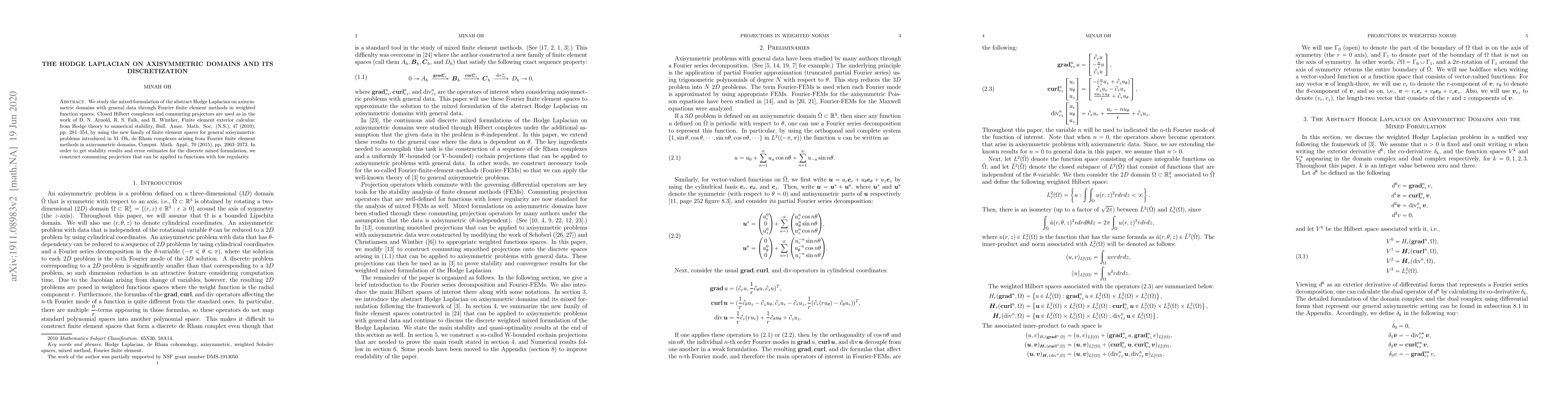 We study the mixed formulation of the abstract Hodge Laplacian on axisymmetric domains with general data through Fourer-finite-element-methods in weighted functions spaces. Closed Hilbert complexes and commuting projectors are used through a family of finite element spaces recently introduced for general axisymmetric problems. In order to get stability results and error estimates for the discrete mixed formulation, we construct commuting projectors that can be applied to functions with low regularity.