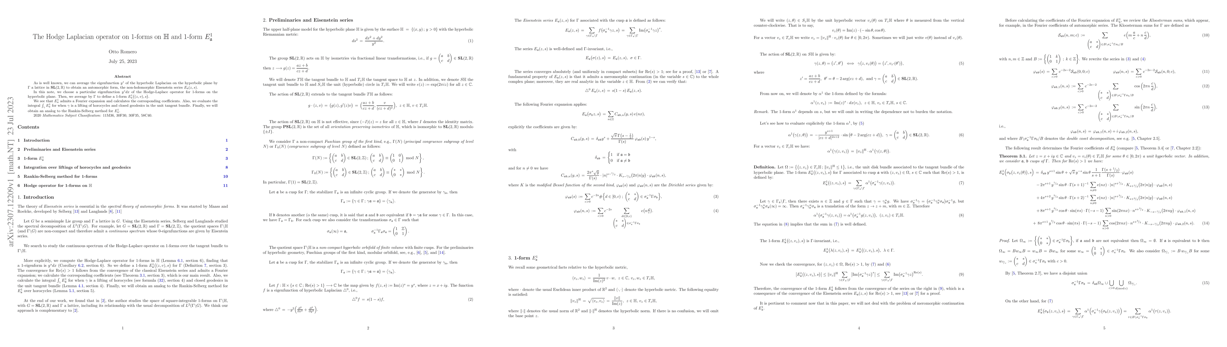 This paper investigates the Hodge Laplacian operator on 1-forms on the hyperbolic plane, defining a specific eigenfunction $y^s dx$ and averaging it by a lattice $\Gamma$ to obtain a 1-form $E_\mathfrak{a}^1$. The study includes a Fourier expansion of $E_\mathfrak{a}^1$ and evaluates its integral along certain curves, concluding with an analog of the Rankin-Selberg method.