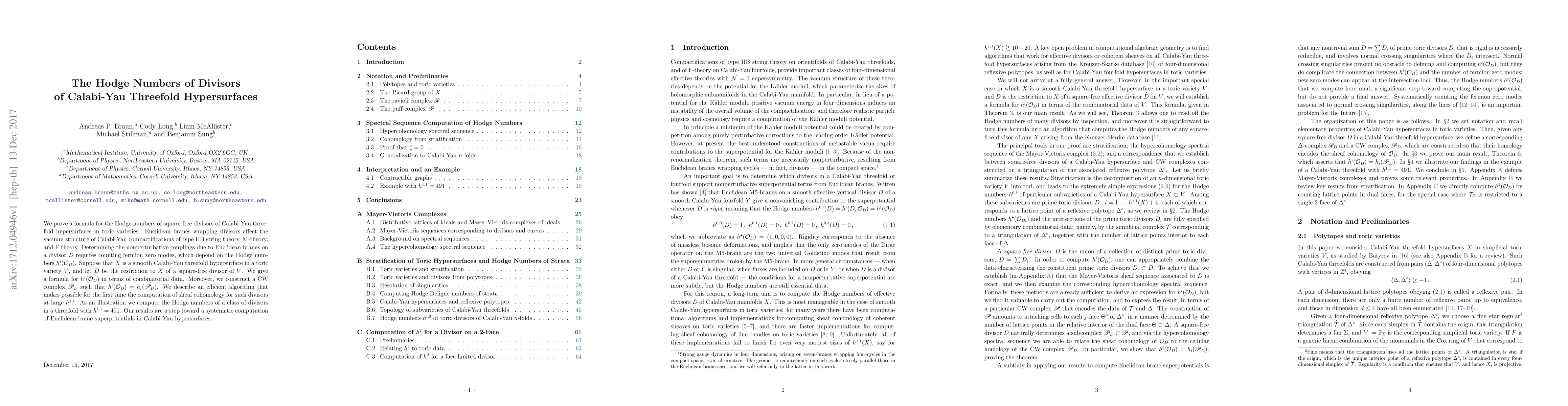 We prove a formula for the Hodge numbers of square-free divisors of Calabi-Yau threefold hypersurfaces in toric varieties. Euclidean branes wrapping divisors affect the vacuum structure of Calabi-Yau compactifications of type IIB string theory, M-theory, and F-theory. Determining the nonperturbative couplings due to Euclidean branes on a divisor $D$ requires counting fermion zero modes, which depend on the Hodge numbers $h^i({\cal{O}}_D)$. Suppose that $X$ is a smooth Calabi-Yau threefold hypersurface in a toric variety $V$, and let $D$ be the restriction to $X$ of a square-free divisor of $V$. We give a formula for $h^i({\cal{O}}_D)$ in terms of combinatorial data. Moreover, we construct a CW complex $\mathscr{P}_D$ such that $h^i({\cal{O}}_D)=h_i(\mathscr{P}_D)$. We describe an efficient algorithm that makes possible for the first time the computation of sheaf cohomology for such divisors at large $h^{1,1}$. As an illustration we compute the Hodge numbers of a class of divisors in a threefold with $h^{1,1}=491$. Our results are a step toward a systematic computation of Euclidean brane superpotentials in Calabi-Yau hypersurfaces.