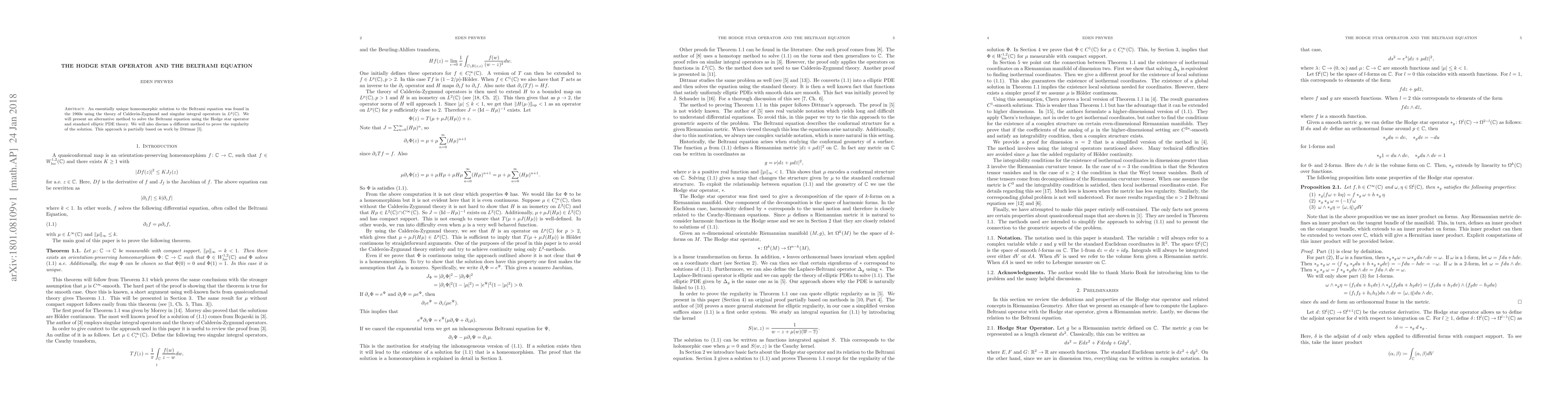 An essentially unique homeomorphic solution to the Beltrami equation was found in the 1960s using the theory of Calder\'{o}n-Zygmund and singular integral operators in $L^p(\mathbb C)$. We will present an alternative method to solve the Beltrami equation using the Hodge star operator and standard elliptic PDE theory. We will also discuss a different method to prove the regularity of the solution. This approach is partially based on work by Dittmar.