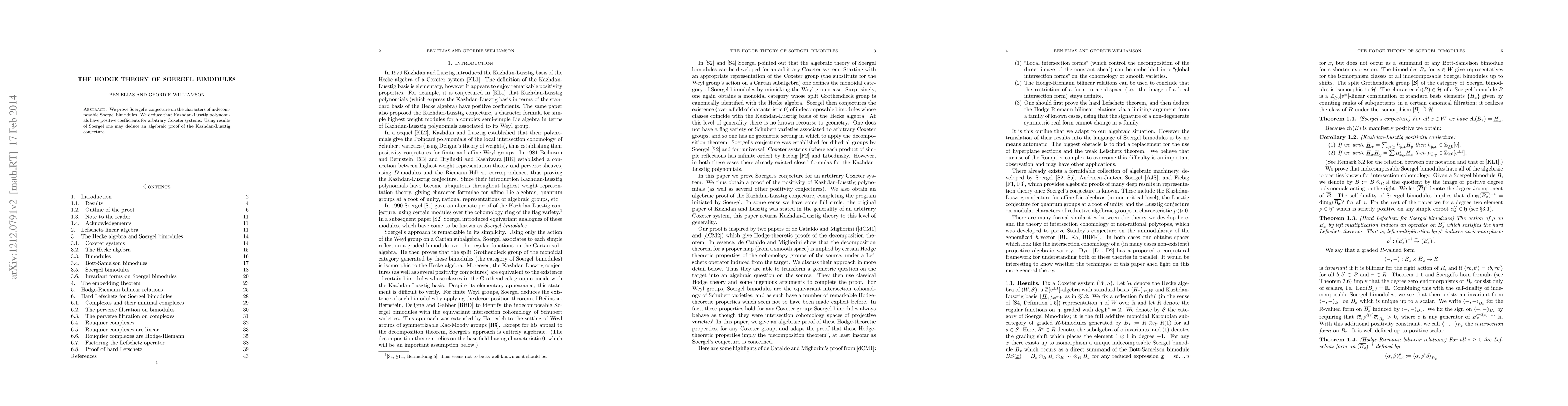 Summary: The paper proves Soergel's conjecture regarding the characters of indecomposable Soergel bimodules, leading to the conclusion that Kazhdan-Lusztig polynomials have positive coefficients for any Coxeter system and provides an algebraic proof of the Kazhdan-Lusztig conjecture.
