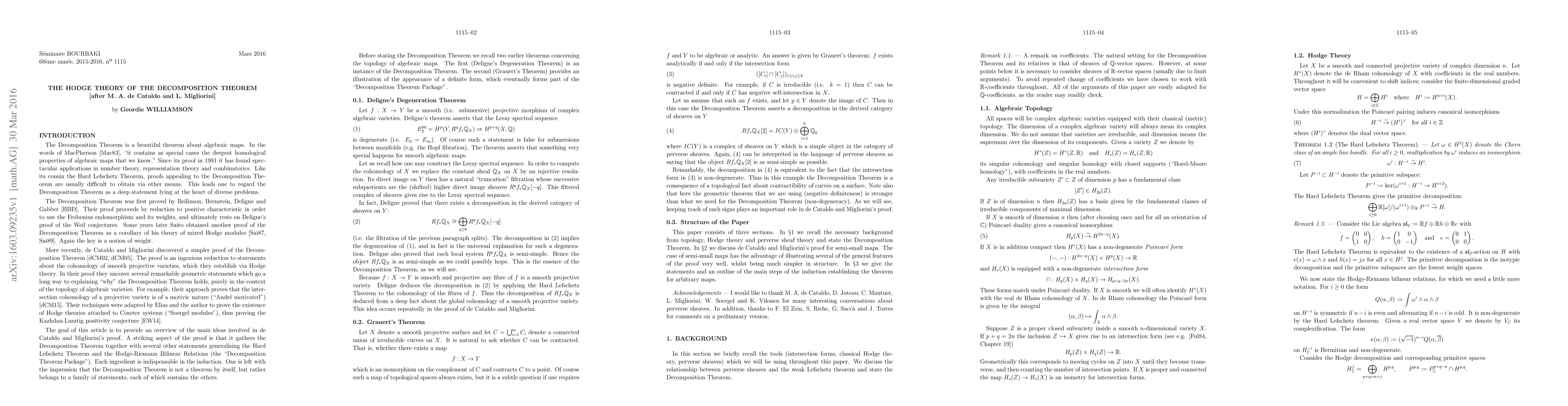The Decomposition Theorem states that intersection cohomology of a complex projective variety can be found in the cohomology of any resolution. De Cataldo and Migliorini provided a simplified proof using classical Hodge theory and perverse sheaves, diverging from earlier proofs reliant on mixed Hodge modules.