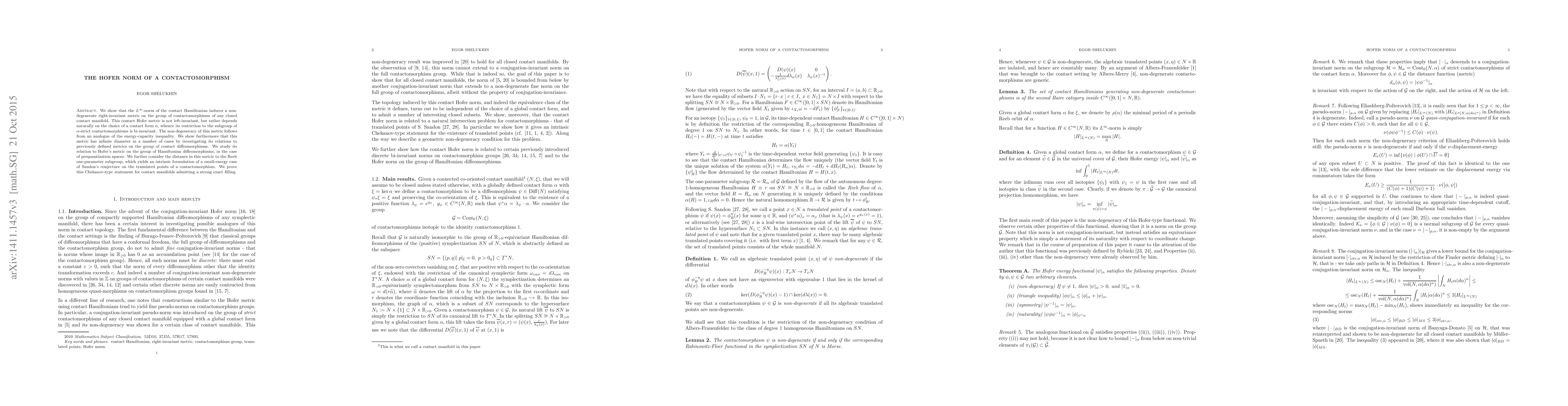 This paper introduces the Hofer norm based on the $L^{\infty}$-norm of the contact Hamiltonian, establishing a non-degenerate right-invariant metric on the group of contactomorphisms. This metric, dependent on the contact form $\alpha$, is bi-invariant for $\alpha$-strict contactomorphisms and shows infinite diameter in certain cases, linking it to the study of Hamiltonian diffeomorphisms and Sandon's conjecture.