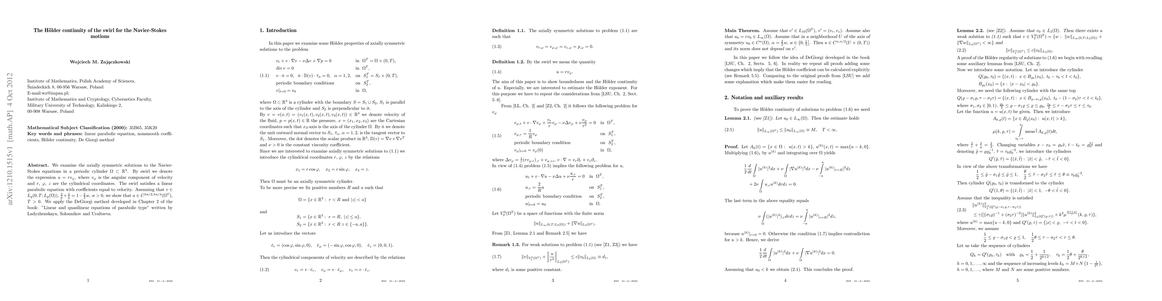 Applying the DeGiorgi Method the Holder continuity of the swirl is proved for solutions to the Navier-Stokes equations from Lq(0,T;Lp) with 3/p+2/q < 1.