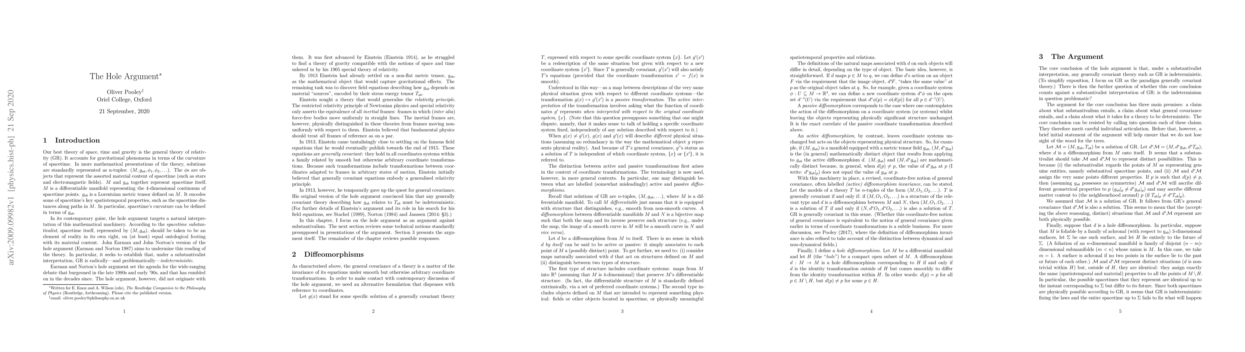 Summary: This paper examines the hole argument, which challenges the notion of spacetime substantivalism, and discusses various potential counterarguments to this philosophical critique.