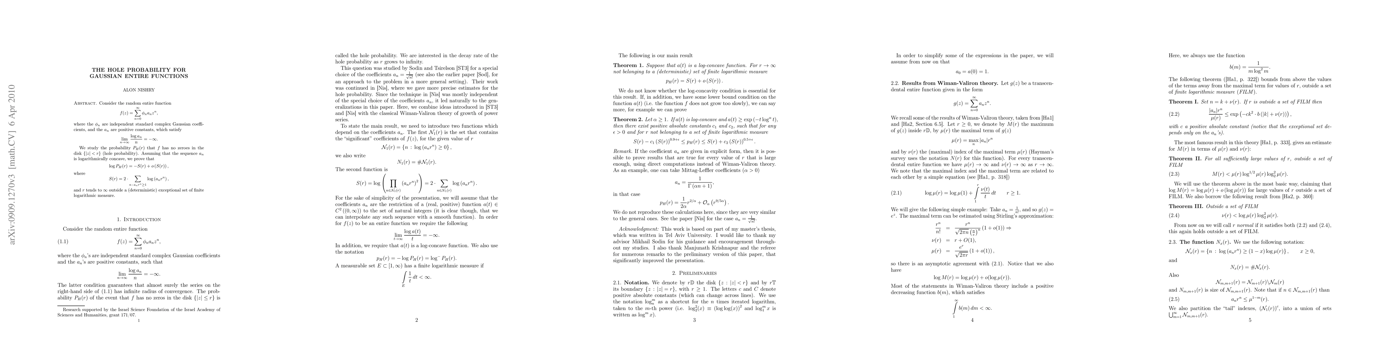 This paper investigates the hole probability for Gaussian random entire functions, focusing on the likelihood of such functions having no zeros within a disc of radius r. The authors derive exact asymptotic expressions for the decay rate of this hole probability as r becomes large, excluding a small deterministic exceptional set.