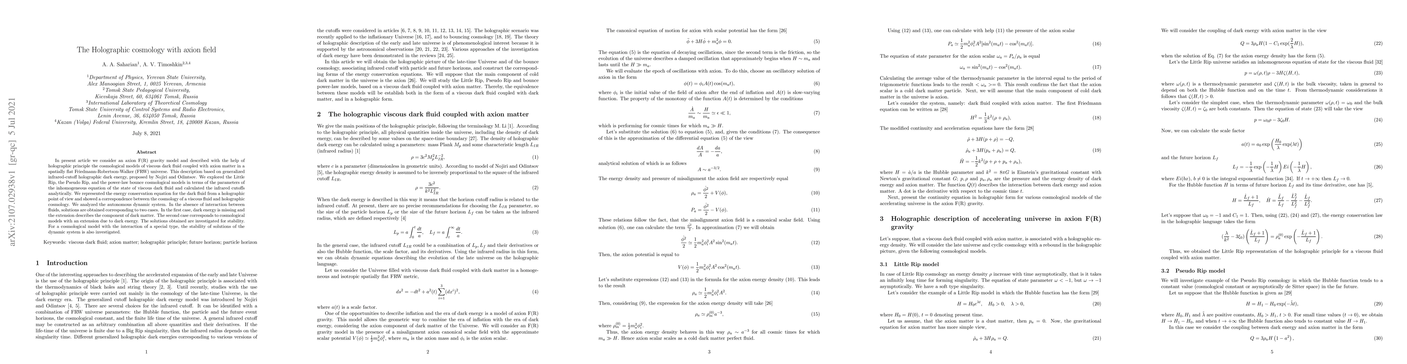 This paper explores an axion F(R) gravity model within a holographic cosmology framework, focusing on viscous dark fluid coupled with an axion field in a flat FRW universe. The study investigates various cosmological models, including the Little Rip, Pseudo Rip, and power-law bounce, and analyzes their stability, revealing a correspondence between viscous fluid cosmology and holographic cosmology.