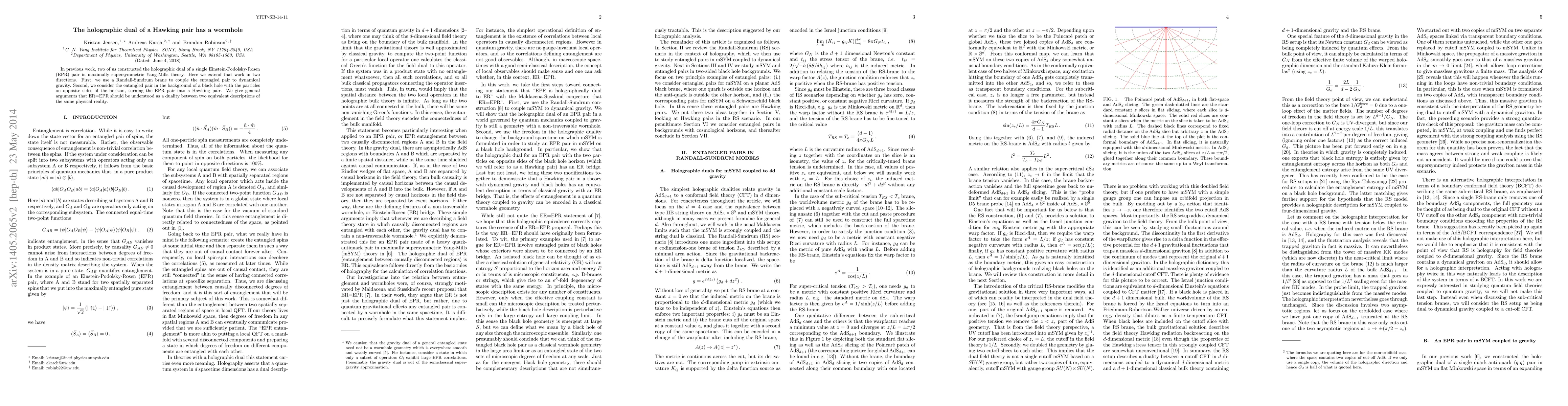 This paper extends the holographic dual of an EPR pair to a Hawking pair by coupling it to dynamical gravity via a Randall-Sundrum brane and placing it in a black hole's background. It argues that ER=EPR represents a duality between two equivalent descriptions of the same physical reality.