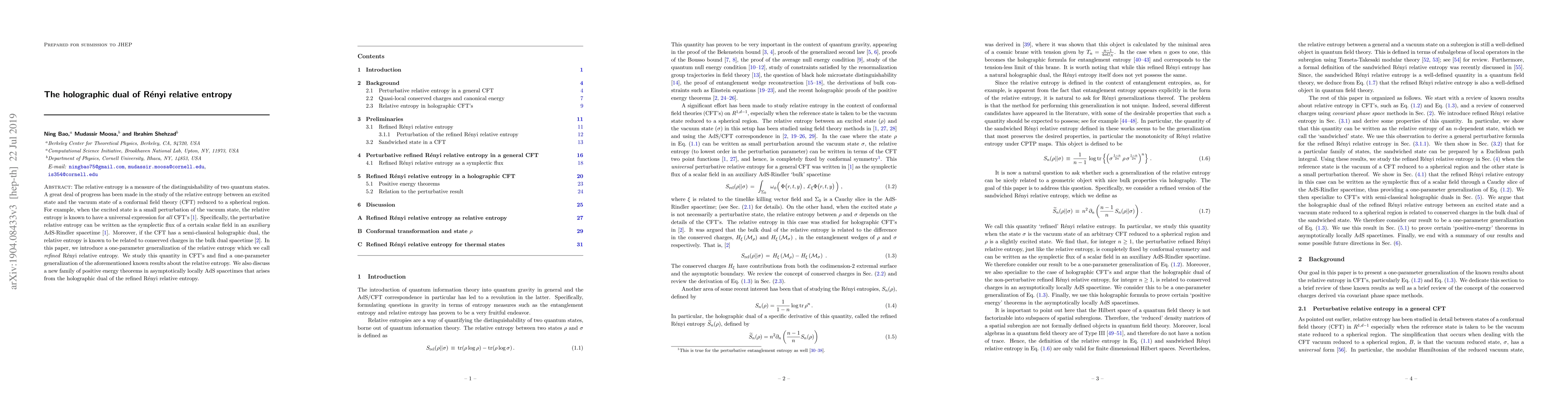 The relative entropy is a measure of the distinguishability of two quantum states. A great deal of progress has been made in the study of the relative entropy between an excited state and the vacuum state of a conformal field theory (CFT) reduced to a spherical region. For example, when the excited state is a small perturbation of the vacuum state, the relative entropy is known to have a universal expression for \textit{all} CFT's \cite{Faulk-GR-entanglement}. Specifically, the perturbative relative entropy can be written as the symplectic flux of a certain scalar field in an \textit{auxiliary} AdS-Rindler spacetime \cite{Faulk-GR-entanglement}. Moreover, if the CFT has a semi-classical holographic dual, the relative entropy is known to be related to conserved charges in the bulk dual spacetime \cite{lashkari2016gravitational}. In this paper, we introduce a one-parameter generalization of the relative entropy which we call \textit{refined} R\'enyi relative entropy. We study this quantity in CFT's and find a one-parameter generalization of the aforementioned known results about the relative entropy. We also discuss a new family of positive energy theorems in asymptotically locally AdS spacetimes that arises from the holographic dual of the refined R\'enyi relative entropy.