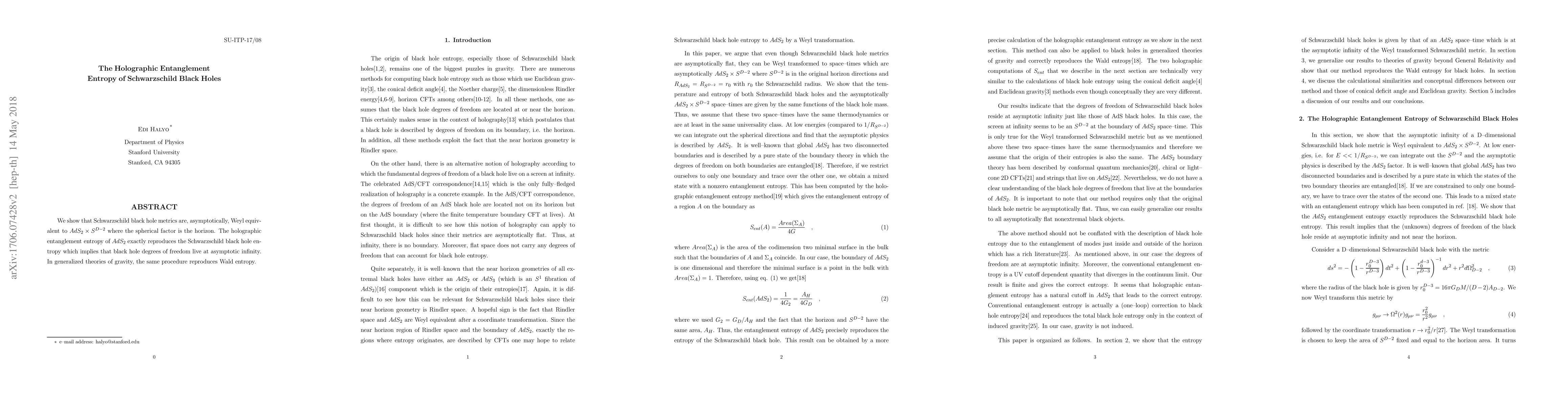 This paper demonstrates that Schwarzschild black holes are asymptotically Weyl equivalent to $AdS_2 \times S^{D-2}$, with the holographic entanglement entropy of $AdS_2$ matching the Schwarzschild entropy, indicating that black hole degrees of freedom reside at asymptotic infinity. This method also aligns with Wald entropy in generalized gravity theories.
