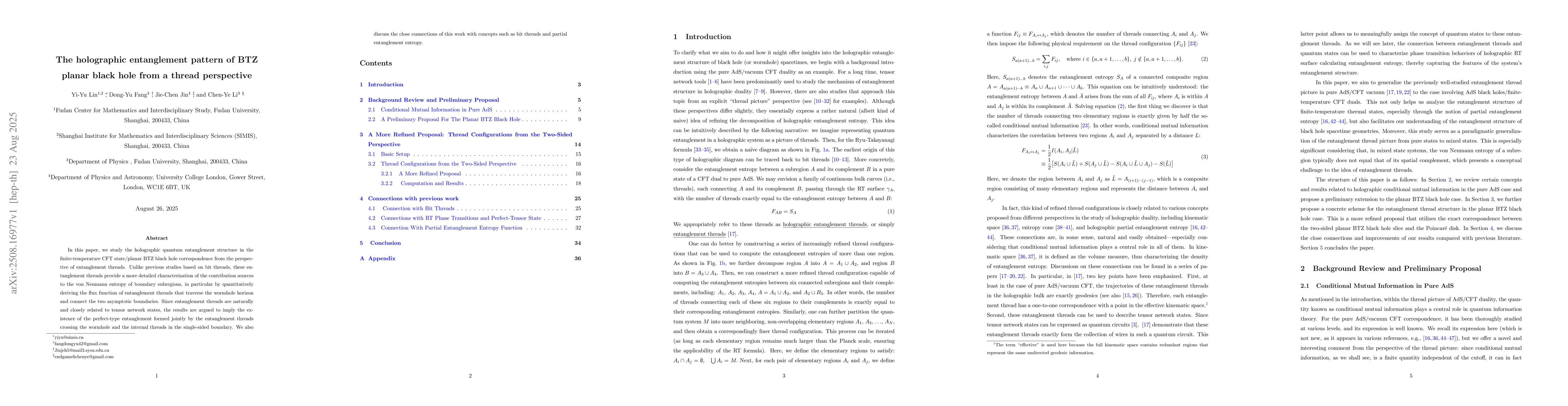 In this paper, we study the holographic quantum entanglement structure in the finite-temperature CFT state/planar BTZ black hole correspondence from the perspective of entanglement threads. Unlike previous studies based on bit threads, these entanglement threads provide a more detailed characterization of the contribution sources to the von Neumann entropy of boundary subregions, in particular by quantitatively deriving the flux function of entanglement threads that traverse the wormhole horizon and connect the two asymptotic boundaries. Since entanglement threads are naturally and closely related to tensor network states, the results are argued to imply the existence of the perfect-type entanglement formed jointly by the entanglement threads crossing the wormhole and the internal threads in the single-sided boundary. We also discuss the close connections of this work with concepts such as bit threads and partial entanglement entropy.