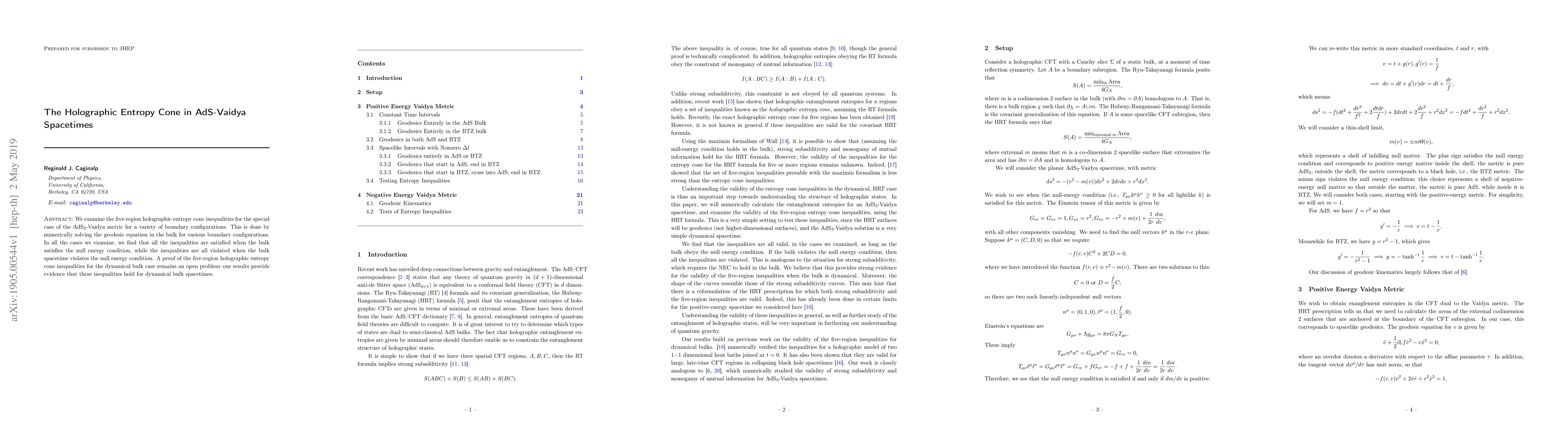 We examine the five-region holographic entropy cone inequalities for the special case of the AdS$_3$-Vaidya metric for a variety of boundary configurations. This is done by numerically solving the geodesic equation in the bulk for various boundary configurations. In all the cases we examine, we find that all the inequalities are satisfied when the bulk satisfies the null energy condition, while the inequalities are all violated when the bulk spacetime violates the null energy condition. A proof of the five-region holographic entropy cone inequalities for the dynamical bulk case remains an open problem--our results provide evidence that these inequalities hold for dynamical bulk spacetimes.