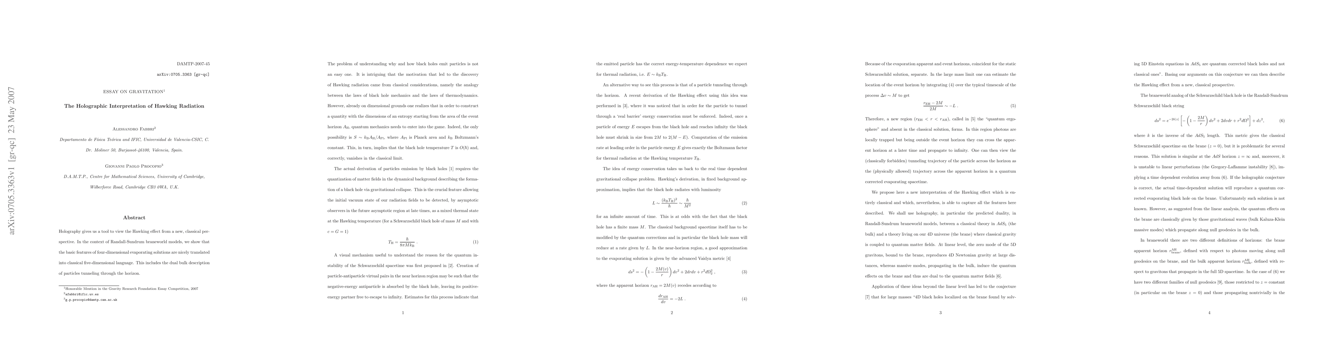 Holography gives us a tool to view the Hawking effect from a new, classical perspective. In the context of Randall-Sundrum braneworld models, we show that the basic features of four-dimensional evaporating solutions are nicely translated into classical five-dimensional language. This includes the dual bulk description of particles tunneling through the horizon.