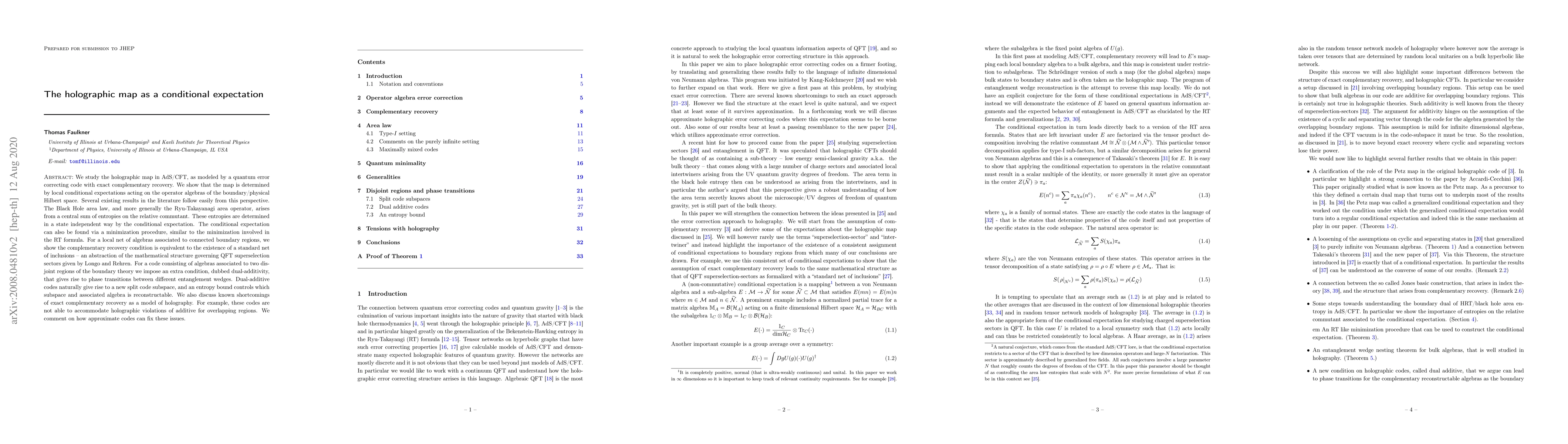 We study the holographic map in AdS/CFT, as modeled by a quantum error correcting code with exact complementary recovery. We show that the map is determined by local conditional expectations acting on the operator algebras of the boundary/physical Hilbert space. Several existing results in the literature follow easily from this perspective. The Black Hole area law, and more generally the Ryu-Takayanagi area operator, arises from a central sum of entropies on the relative commutant. These entropies are determined in a state independent way by the conditional expectation. The conditional expectation can also be found via a minimization procedure, similar to the minimization involved in the RT formula. For a local net of algebras associated to connected boundary regions, we show the complementary recovery condition is equivalent to the existence of a standard net of inclusions -- an abstraction of the mathematical structure governing QFT superselection sectors given by Longo and Rehren. For a code consisting of algebras associated to two disjoint regions of the boundary theory we impose an extra condition, dubbed dual-additivity, that gives rise to phase transitions between different entanglement wedges. Dual-additive codes naturally give rise to a new split code subspace, and an entropy bound controls which subspace and associated algebra is reconstructable. We also discuss known shortcomings of exact complementary recovery as a model of holography. For example, these codes are not able to accommodate holographic violations of additive for overlapping regions. We comment on how approximate codes can fix these issues.