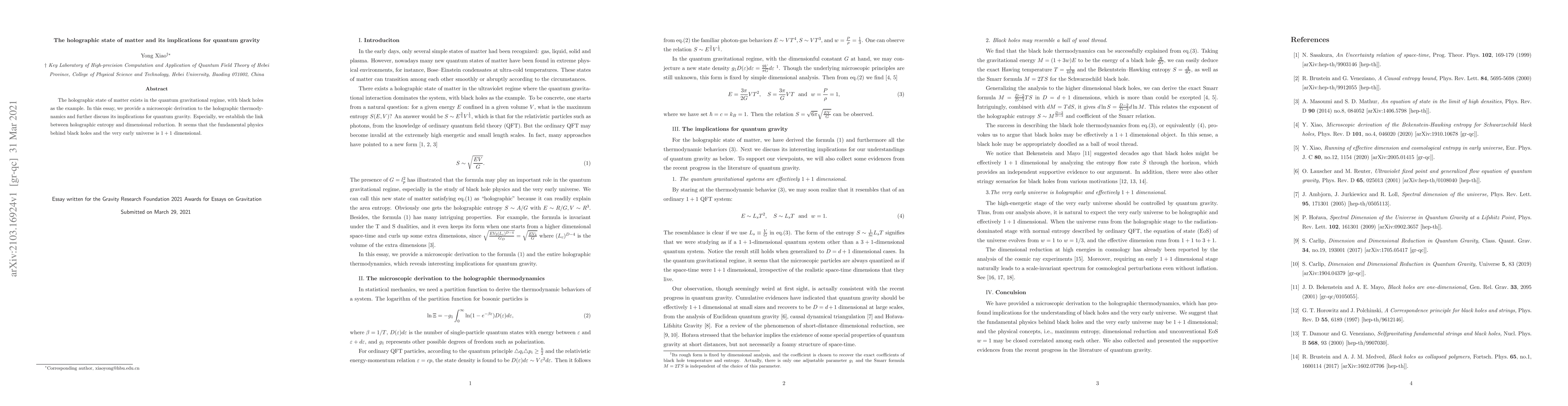 The holographic state of matter exists in the quantum gravitational regime, with black holes as the example. In this essay, we provide a microscopic derivation to the holographic thermodynamics and further discuss its implications for quantum gravity. Especially, we establish the link between holographic entropy and dimensional reduction. It seems that the fundamental physics behind black holes and the very early universe is $1+1$ dimensional.