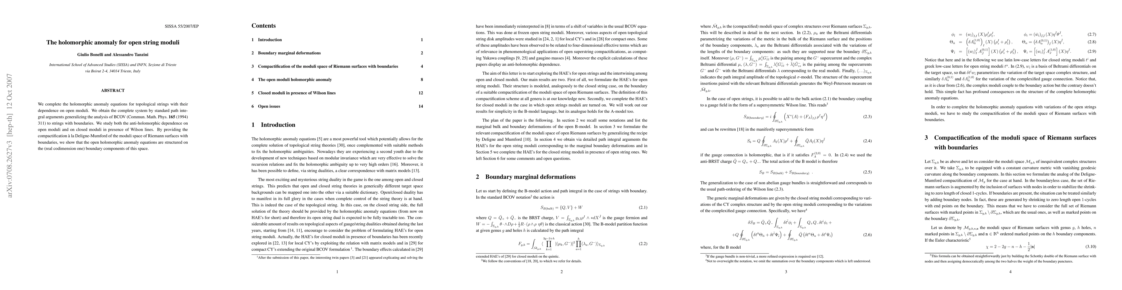 Summary: This paper completes the holomorphic anomaly equations for topological strings, including their dependence on open moduli, through a generalization of BCOV analysis. It explores both anti-holomorphic dependencies on open and closed moduli, particularly in the presence of Wilson lines, and demonstrates that these anomaly equations are structured along boundary components of the compactification of the moduli space of Riemann surfaces with boundaries.