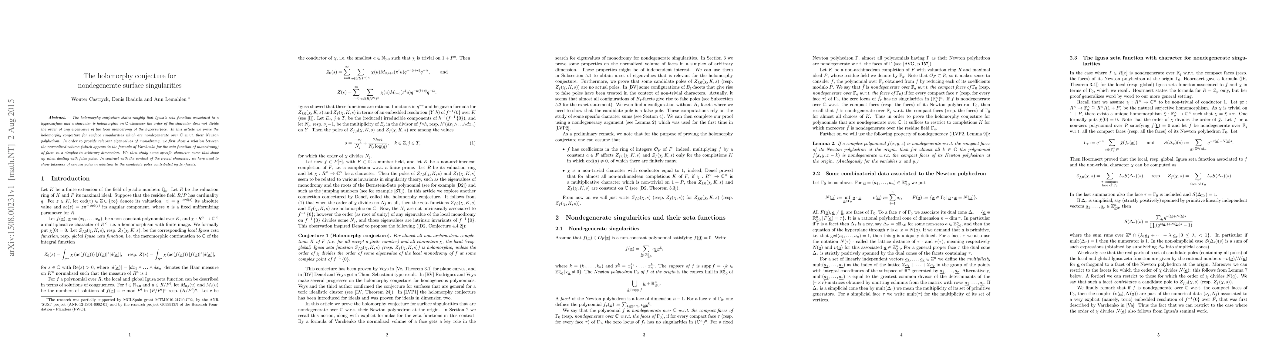 This paper proves the holomorphy conjecture for nondegenerate surface singularities over $\mathbb{C}$ concerning Igusa's zeta function, by establishing a relation between the normalized volume of faces in a simplex and studying specific character sums to demonstrate the fakeness of certain poles.