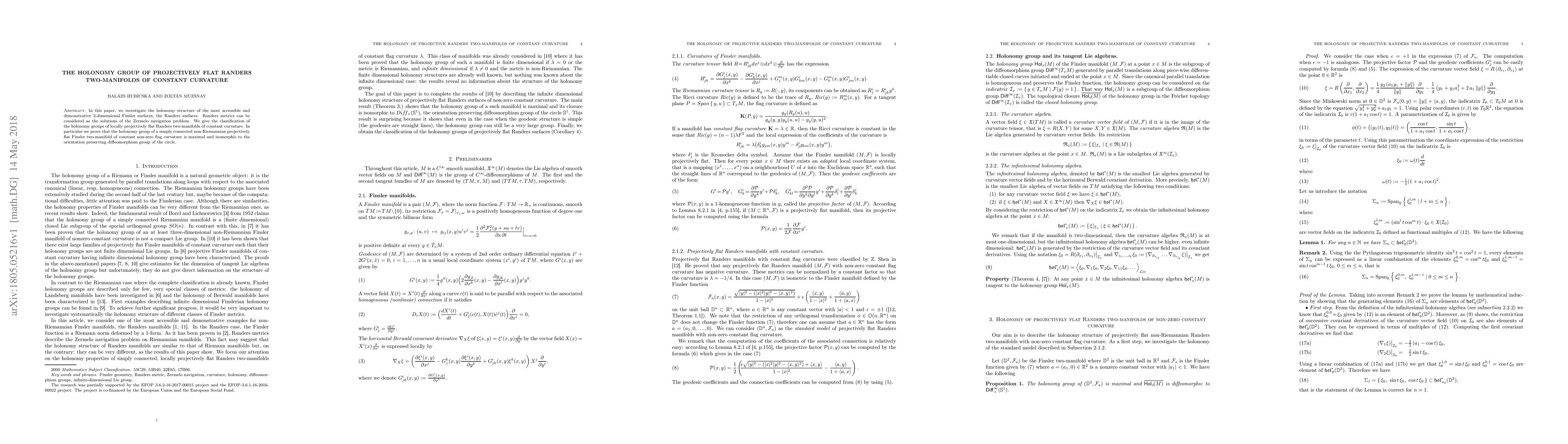 Summary: This paper classifies the holonomy groups of locally projectively flat Randers two-manifolds with constant curvature, showing that for simply connected, non-Riemannian projectively flat surfaces, the holonomy group is maximal and isomorphic to the orientation-preserving diffeomorphism group of the circle.