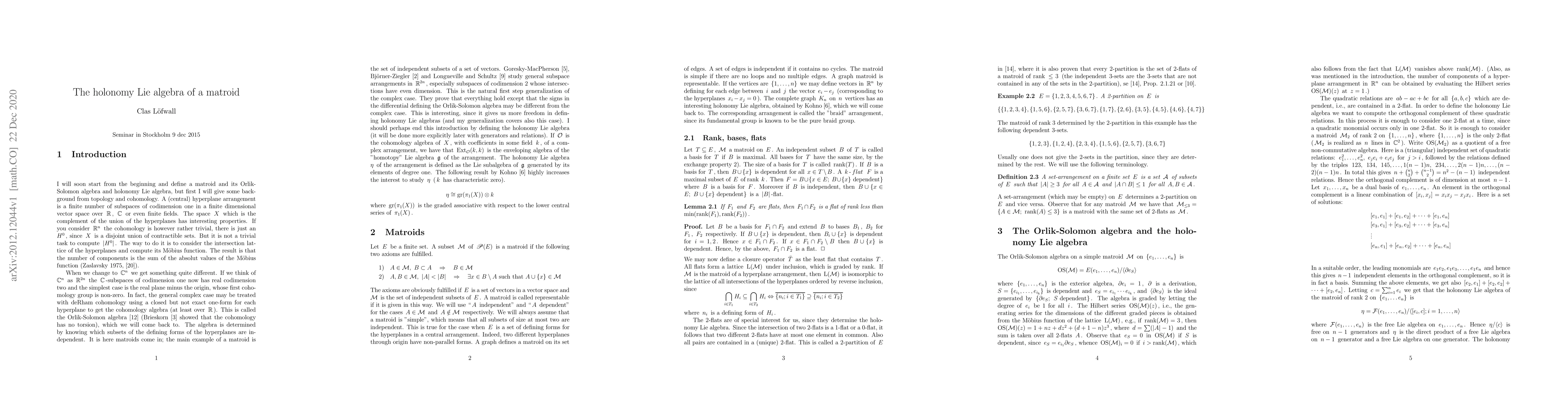 We will start from the beginning and define a matroid and its Orlik-Solomon algebra and holonomy Lie algebra, but first we give some background from topology and cohomology. A (central) hyperplane arrangement is a finite number of subspaces of codimension one in a finite dimensional vector space over R, C or even finite fields. The space X which is the complement of the union of the hyperplanes has interesting properties. If you consider R^n the cohomology is however rather trivial, there is just an H^0, since X is a disjoint union of contractible sets. But it is not a trivial task to compute |H^0|. The way to do it is to consider the intersection lattice of the hyperplanes and compute its M\"obius function. The result is that the number of components is the sum of the absolut values of the M\"obius function (Zaslavsky 1975).