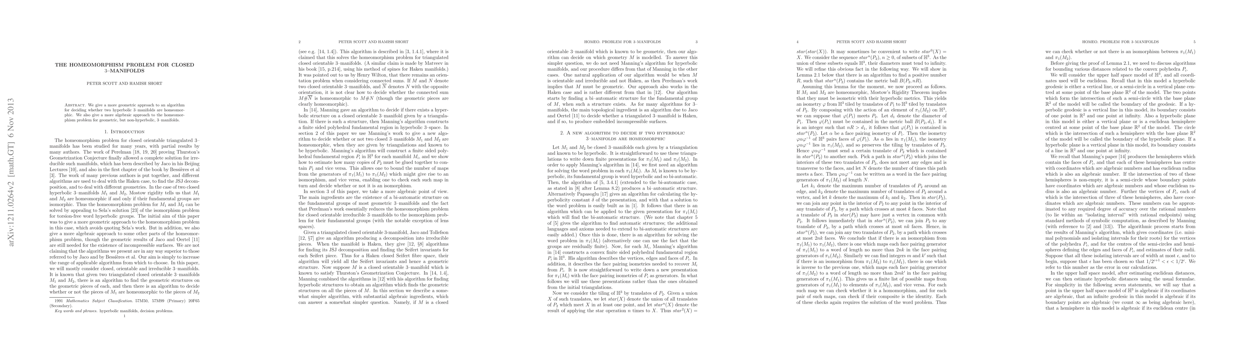 We give a more geometric approach to an algorithm for deciding whether two hyperbolic 3-manifolds are homeomorphic. We also give a more algebraic approach to the homeomorphism problem for geometric, but non-hyperbolic, 3-manifolds.