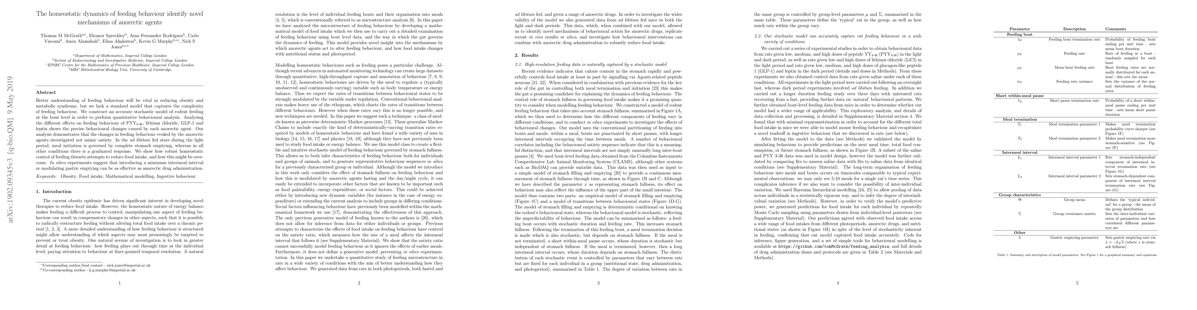 Better understanding of feeding behaviour will be vital in reducing obesity and metabolic syndrome, but we lack a standard model that captures the complexity of feeding behaviour. We construct an accurate stochastic model of rodent feeding at the bout level in order to perform quantitative behavioural analysis. Analysing the different effects on feeding behaviour of PYY 3-36, lithium chloride, GLP-1 and leptin shows the precise behavioural changes caused by each anorectic agent, and demonstrates that these changes do not mimic satiety. In the ad libitum fed state during the light period, meal initiation is governed by complete stomach emptying, whereas in all other conditions there is a graduated response. We show how robust homeostatic control of feeding thwarts attempts to reduce food intake, and how this might be overcome. In silico experiments suggest that introducing a minimum intermeal interval or modulating gastric emptying can be as effective as anorectic drug administration.