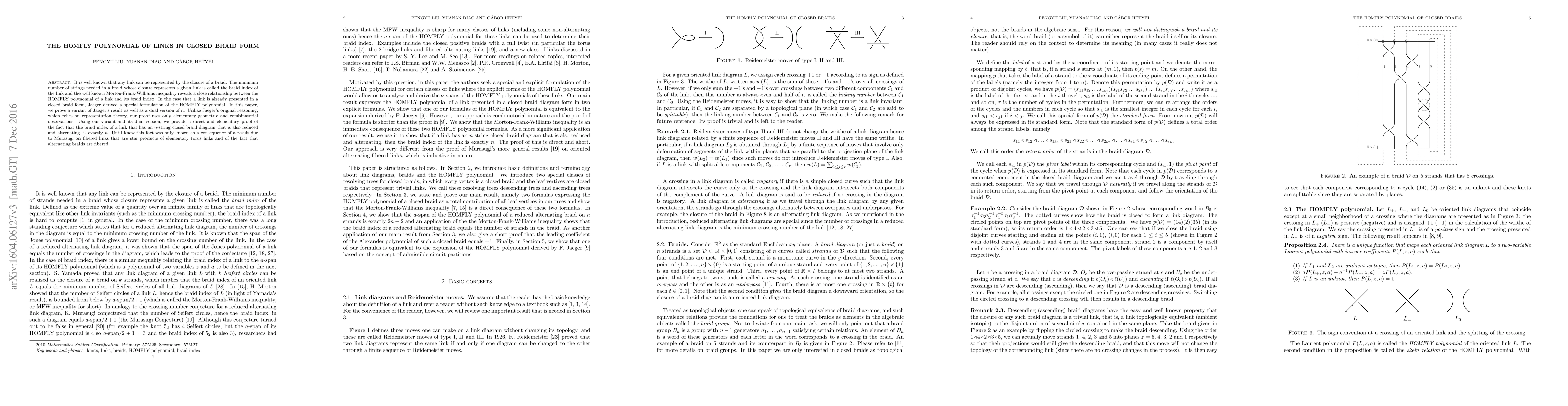 This paper presents an elementary geometric and combinatorial proof of Jaeger's special formulation of the HOMFLY polynomial for links in closed braid form, along with its dual version, and establishes that the braid index of such links is exactly equal to the number of strings in the braid.