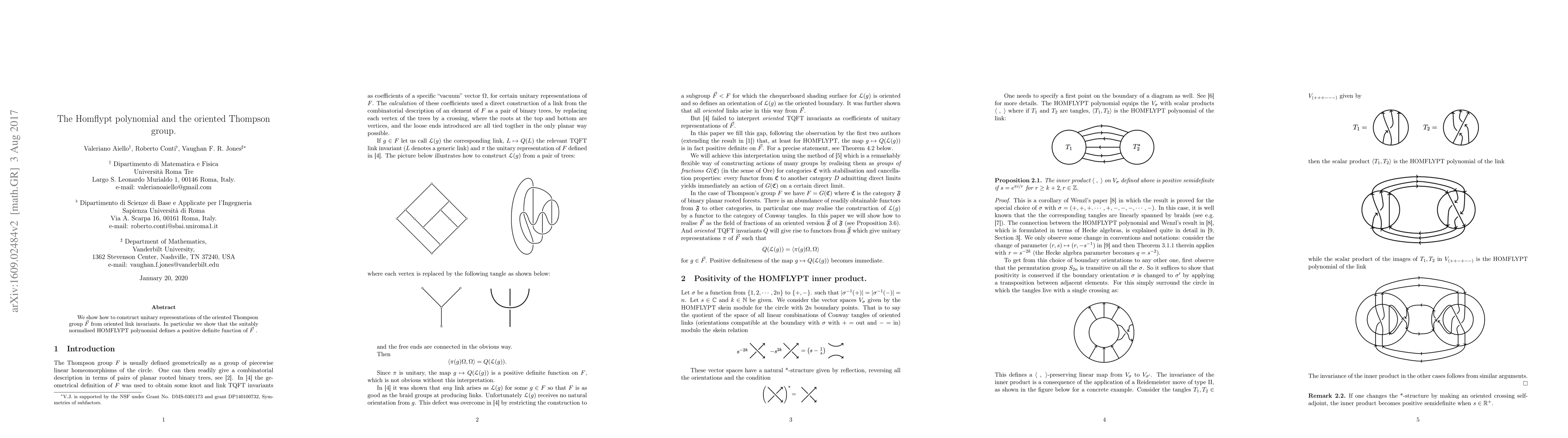 The paper constructs unitary representations of the oriented Thompson group $\vec{F}$ from oriented link invariants, specifically using the HOMFLYPT polynomial normalized to define a positive definite function on $\vec{F}$.