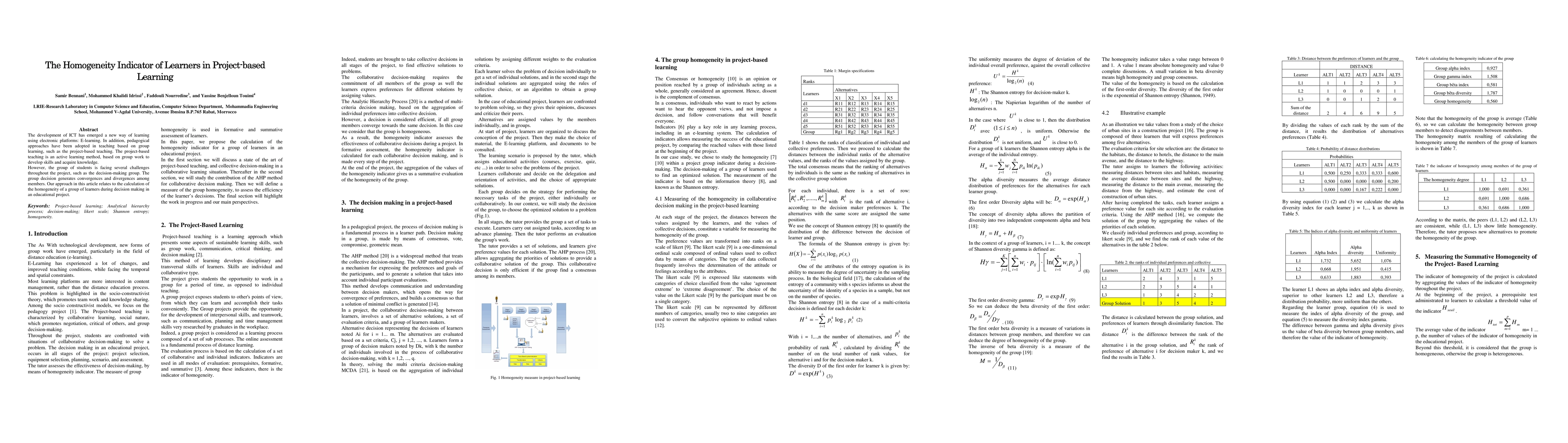 The development of ICT has emerged a new way of learning using electronic platforms: E-learning. In addition, pedagogical approaches have been adopted in teaching based on group learning, such as the project-based teaching. The project-based teaching is an active learning method, based on group work to develop skills and acquire knowledge. However, the group of students is facing several challenges throughout the project, such as the decision-making group. The group decision generates convergences and divergences among members. Our approach in this article relates to the calculation of the homogeneity of a group of learners during decision making in an educational project.