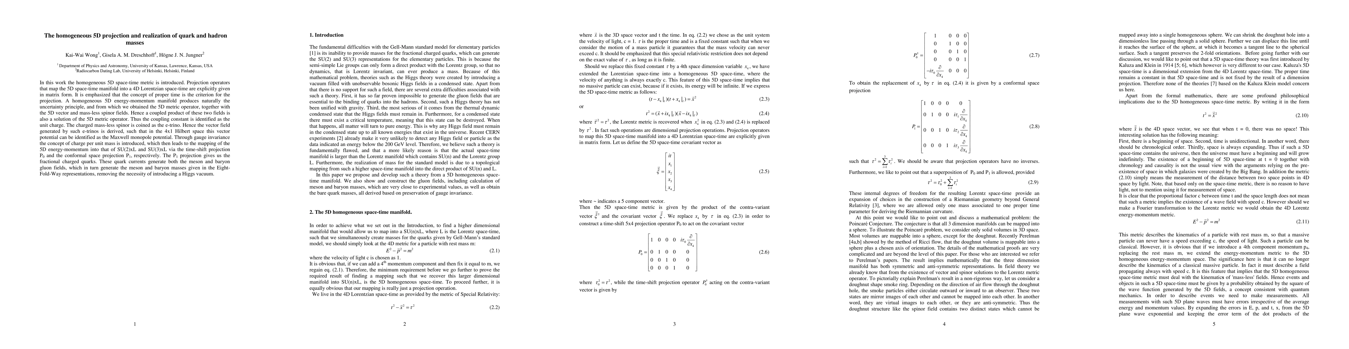 In this work the homogeneous 5D space-time metric is introduced. Projection operators that map the 5D space-time manifold into a 4D Lorentzian space-time are explicitly given in matrix form. It is emphasized that the concept of proper time is the criterion for the projection. A homogeneous 5D energy-momentum manifold produces naturally the uncertainty principle, and from which we obtained the 5D metric operator, together with the 5D vector and mass-less spinor fields. A naturally coupled product of these two fields is also a solution of the 5D metric operator. Thus the coupling constant is identified as the unit charge. The charged mass-less spinor is coined as the e-trino. Hence the vector field generated by such e-trinos is derived, such that in the 4x1 Hilbert space this vector potential can be identified as the Maxwell monopole potential. Through gauge invariance the concept of charge per unit mass is introduced, which then leads to the mapping of the 5D energy-momentum into that of SU(2)xL and SU(3)xL via the time-shift projection P0 and the conformal space projection P1, respectively. The P1 projection gives us the fractional charged quarks. These quark currents generate both the meson and baryon gluon fields, which in turn generate the meson and baryon masses given in the Eight-Fold-Way representations, removing the necessity of introducing a Higgs vacuum.