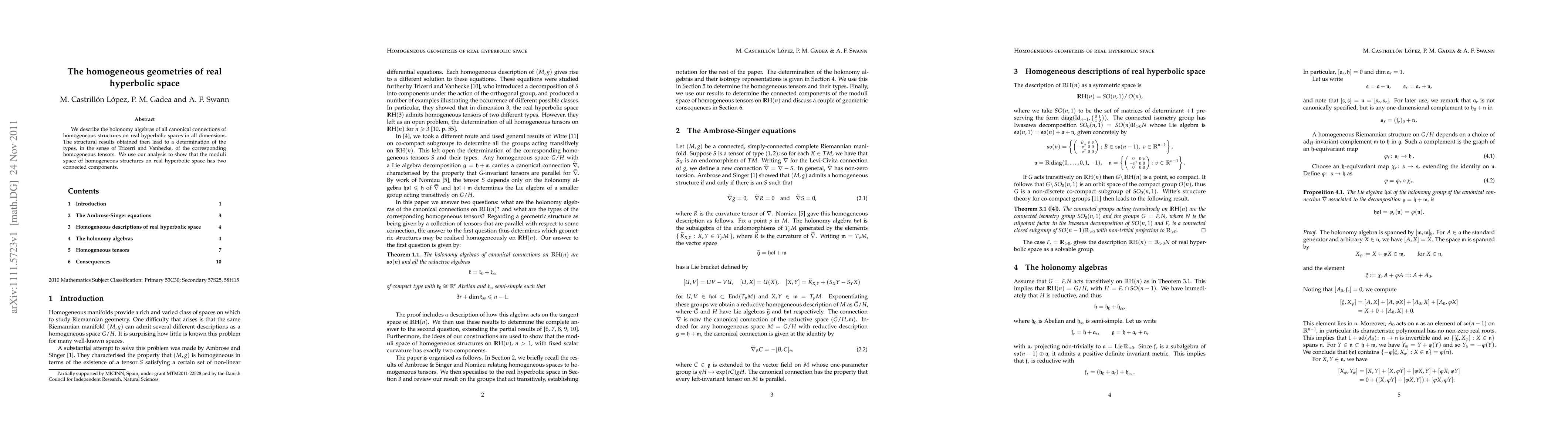 We describe the holonomy algebras of all canonical connections of homogeneous structures on real hyperbolic spaces in all dimensions. The structural results obtained then lead to a determination of the types, in the sense of Tricerri and Vanhecke, of the corresponding homogeneous tensors. We use our analysis to show that the moduli space of homogeneous structures on real hyperbolic space has two connected components.
