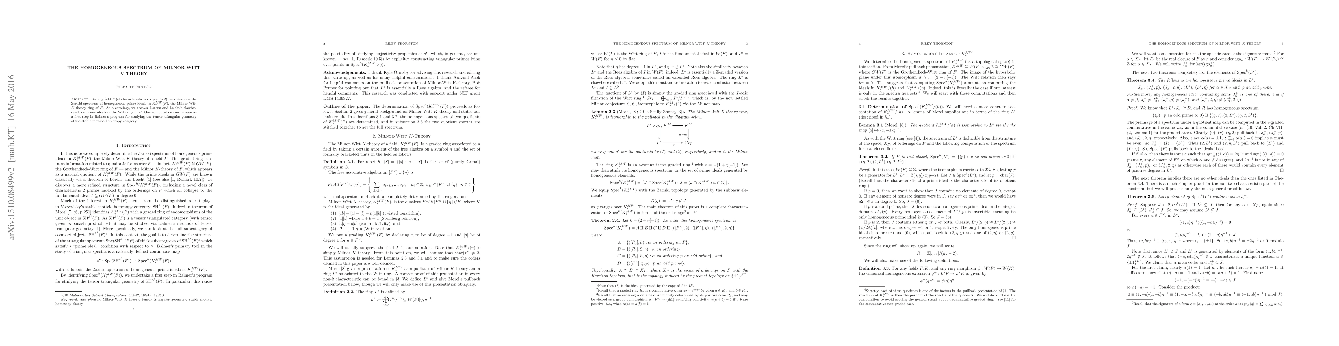 The paper determines the Zariski spectrum of homogeneous prime ideals in Milnor-Witt $K$-theory for fields of characteristic not 2, extending classical results on prime ideals in the Witt ring and setting a foundation for tensor triangular geometry studies in stable motivic homotopy.