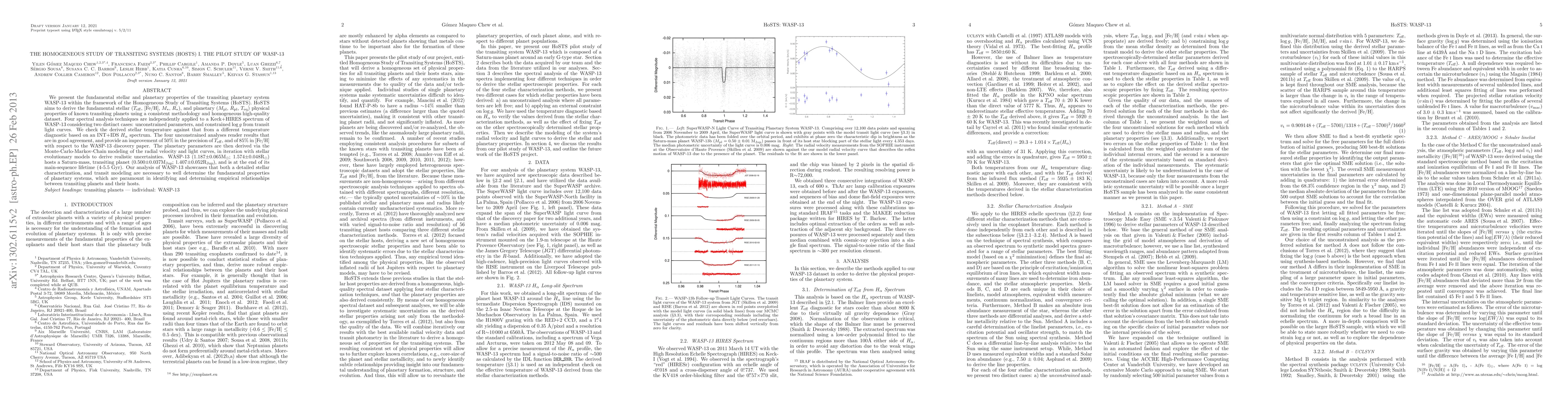 The study presents a detailed analysis of the WASP-13 planetary system using the Homogeneous Study of Transiting Systems (HoSTS) methodology. It improves the precision of stellar temperature (Teff) and metallicity ([Fe/H]) by 50% and 85% respectively, compared to previous measurements. The research derives accurate stellar and planetary properties, revealing WASP-13 as a Sun-like star nearing the end of its main sequence, hosting a Saturn-mass planet. This methodology is crucial for precise characterization of transiting planetary systems and for establishing empirical relationships between planets and their hosts.