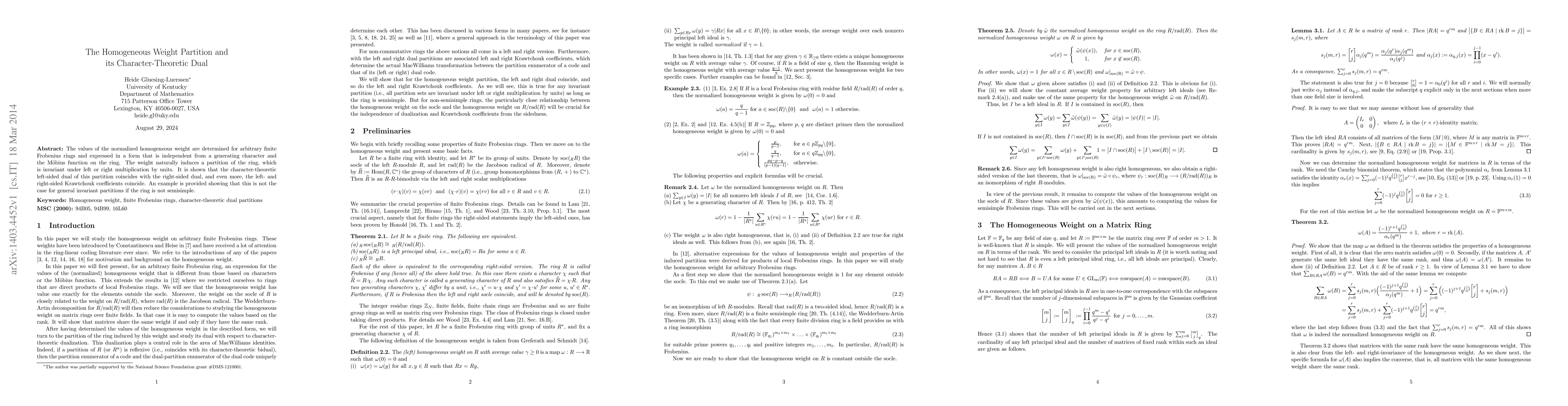 The values of the normalized homogeneous weight are determined for arbitrary finite Frobenius rings and expressed in a form that is independent from a generating character and the M\"obius function on the ring. The weight naturally induces a partition of the ring, which is invariant under left or right multiplication by units. It is shown that the character-theoretic left-sided dual of this partition coincides with the right-sided dual, and even more, the left- and right-sided Krawtchouk coefficients coincide. An example is provided showing that this is not the case for general invariant partitions if the ring is not semisimple.