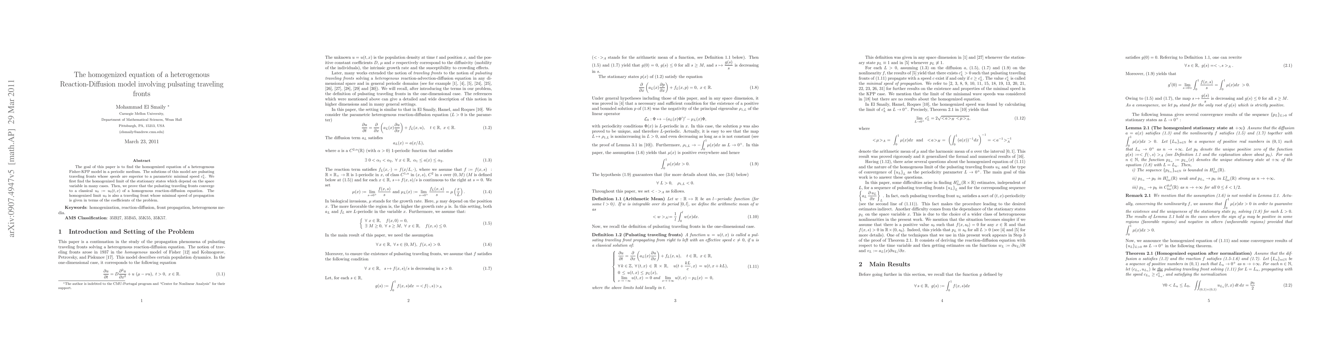 Researchers found a homogenized equation for pulsating traveling fronts in heterogeneous reaction-diffusion models, revealing that these fronts converge to a classical travelling front with a minimal speed of propagation based on the model's coefficients.