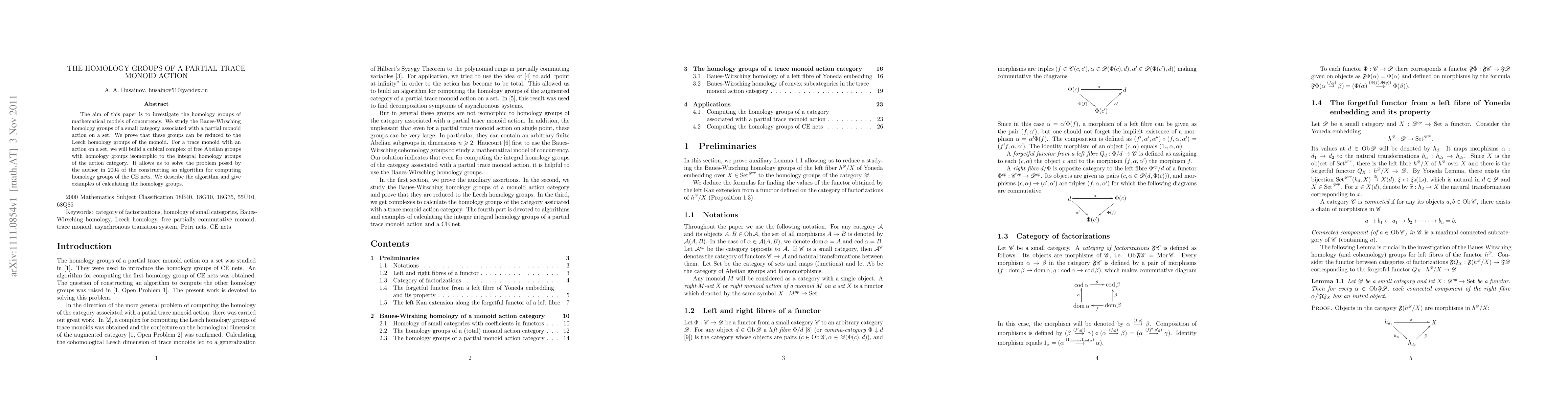 This paper investigates the homology groups of concurrency models, specifically the Baues-Wirsching homology groups of a category associated with a partial monoid action. The study reduces these groups to Leech homology groups of the monoid and constructs an algorithm for computing homology groups of CE nets, providing examples of calculations.