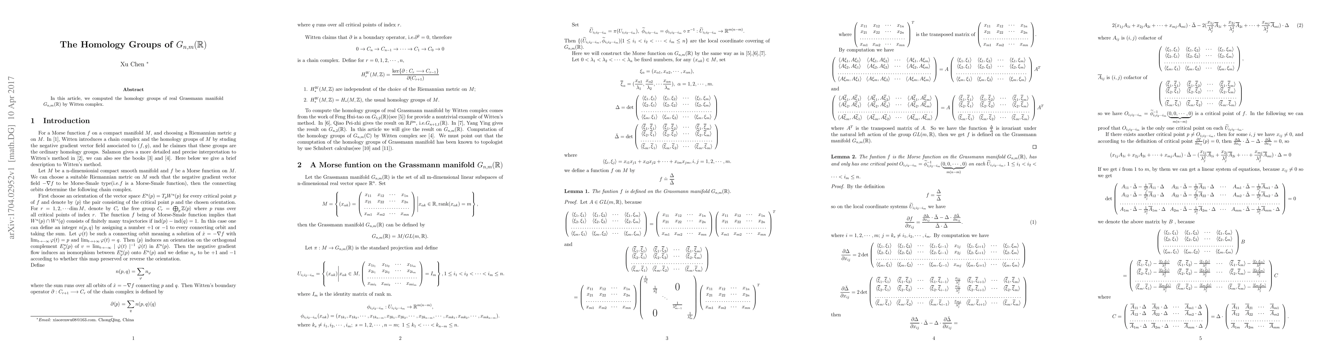 Two-Line Summary: This article computes the homology groups of the real Grassmann manifold $G_{n,m}(\mathbb{R})$ using the Witten complex approach. The findings contribute to understanding the topological structure of these important geometrical objects.