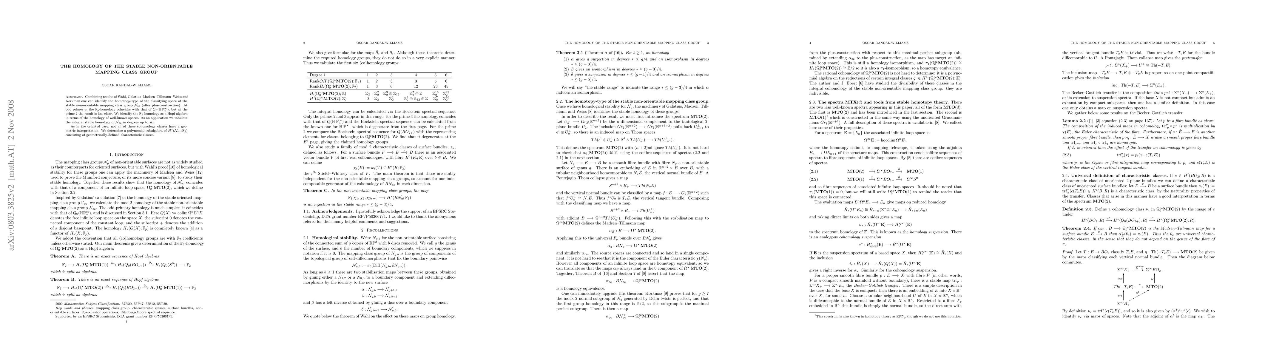 Combining results of Wahl, Galatius--Madsen--Tillmann--Weiss and Korkmaz one can identify the homotopy-type of the classifying space of the stable non-orientable mapping class group $N_\infty$ (after plus-construction). At odd primes p, the F_p-homology coincides with that of $Q_0(HP^\infty_+)$, but at the prime 2 the result is less clear. We identify the F_2-homology as a Hopf algebra in terms of the homology of well-known spaces. As an application we tabulate the integral stable homology of $N_\infty$ in degrees up to six. As in the oriented case, not all of these cohomology classes have a geometric interpretation. We determine a polynomial subalgebra of $H^*(N_\infty ; F_2)$ consisting of geometrically-defined characteristic classes.
