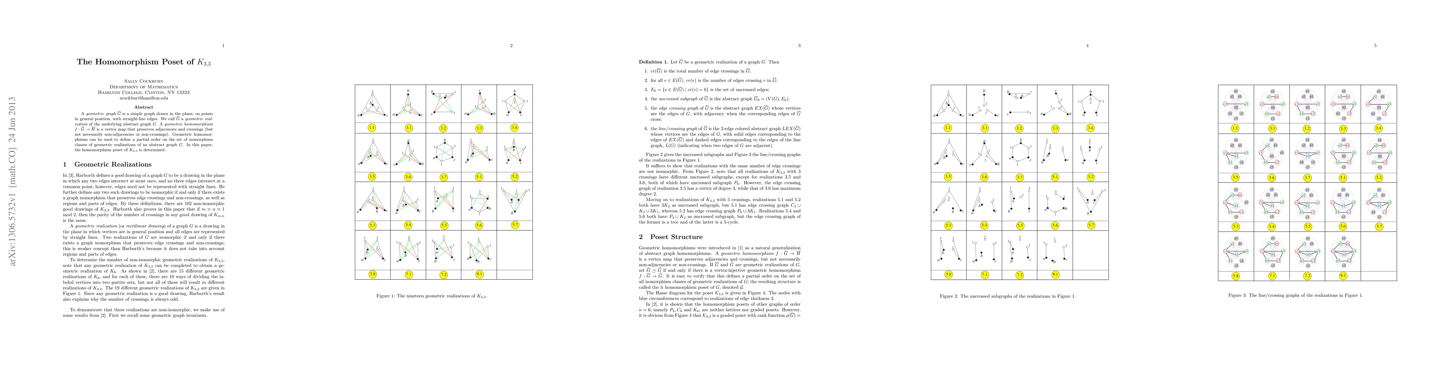 A geometric graph \G is a simple graph drawn in the plane, on points in general position, with straight-line edges. We call \G a geometric realization of the underlying abstract graph G. A geometric homomorphism from \G to \H is a vertex map that preserves adjacencies and crossings (but not necessarily non-adjacencies or non-crossings). Geometric homomorphisms can be used to define a partial order on the set of isomorphism classes of geometric realizations of an abstract graph G. In this paper, the homomorphism poset of K_{3,3} is determined.
