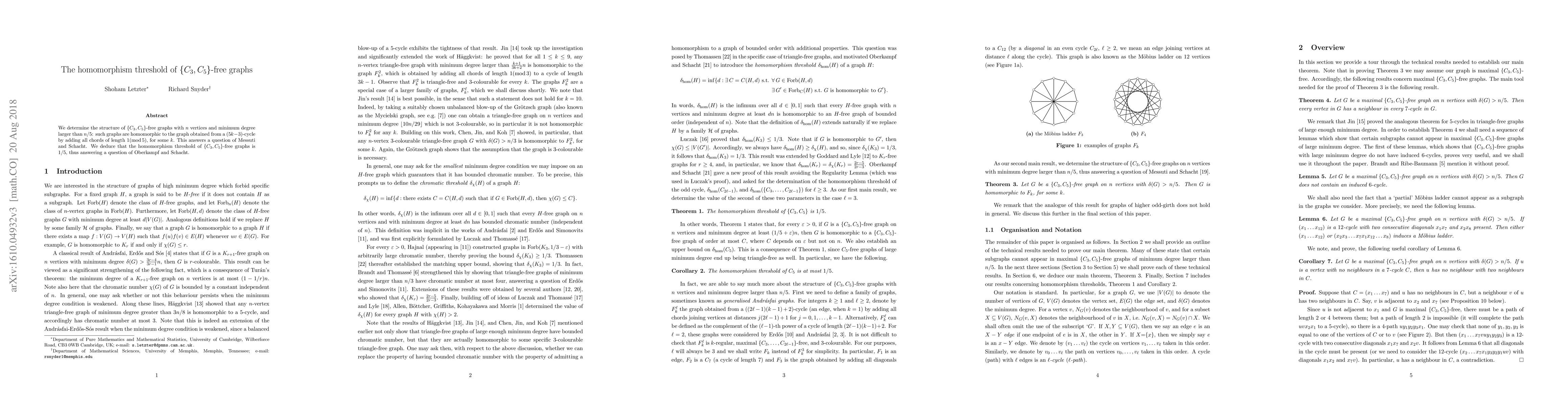 We determine the structure of $\{C_3, C_5\}$-free graphs with $n$ vertices and minimum degree larger than $n/5$: such graphs are homomorphic to the graph obtained from a $(5k - 3)$-cycle by adding all chords of length $1$ mod $5$, for some $k$. This answers a question of Messuti and Schacht. We deduce that the homomorphism threshold of $\{C_3, C_5\}$-free graphs is $1/5$, thus answering a question of Oberkampf and Schacht.