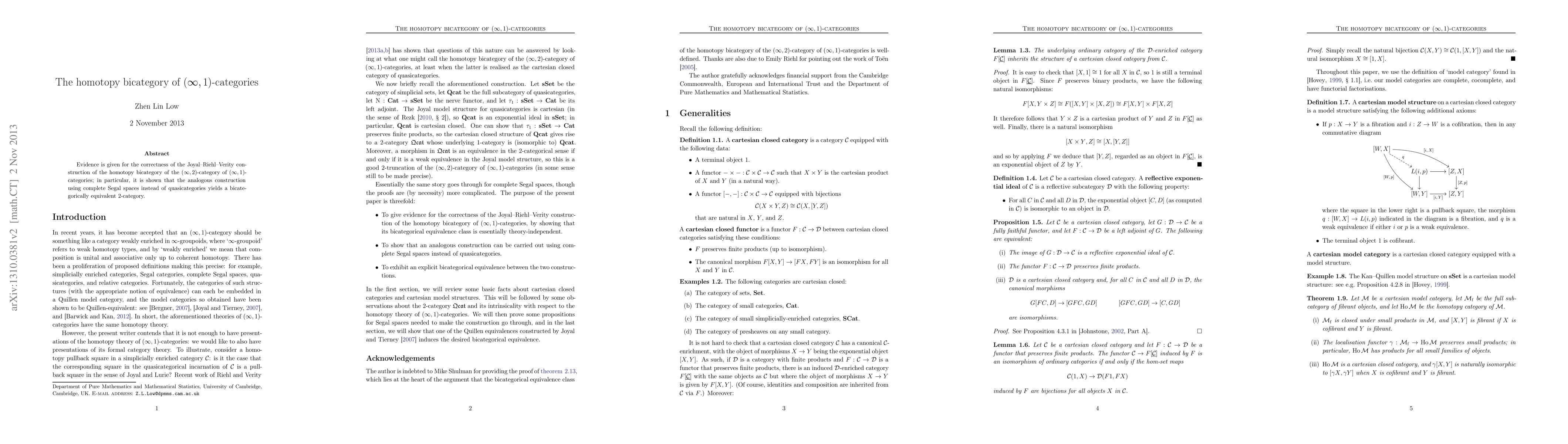 Evidence is given for the correctness of the Joyal-Riehl-Verity construction of the homotopy bicategory of the $(\infty, 2)$-category of $(\infty, 1)$-categories; in particular, it is shown that the analogous construction using complete Segal spaces instead of quasicategories yields a bicategorically equivalent 2-category.