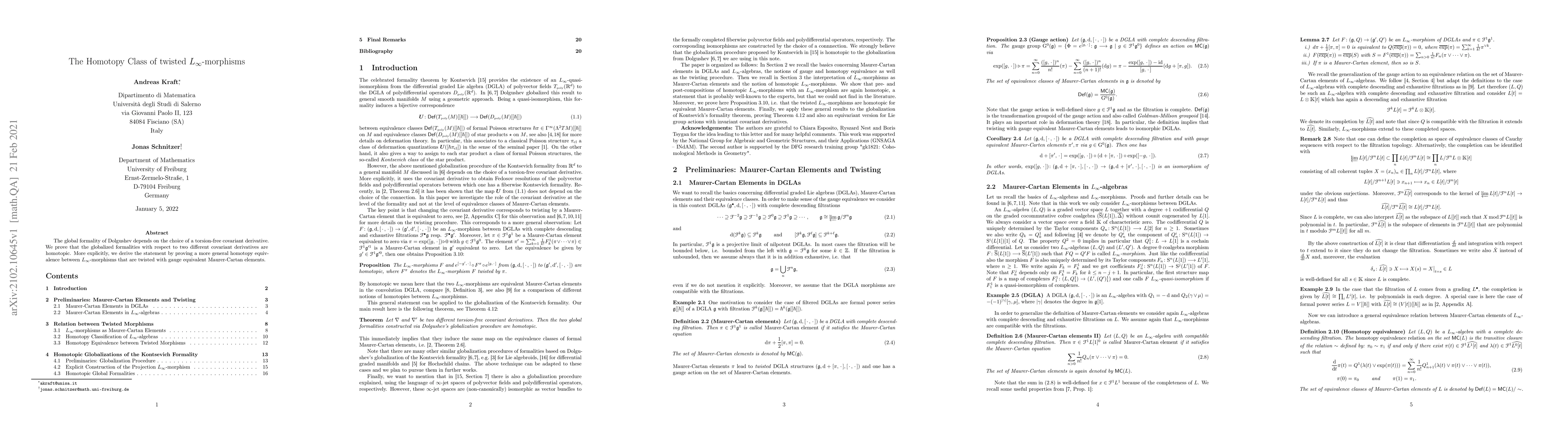 This research proves that globalized formalities in Dolgushev's global formality theory, dependent on torsion-free covariant derivative choices, are homotopic. It establishes a homotopy equivalence between $L_infty$-morphisms twisted by gauge equivalent Maurer-Cartan elements.