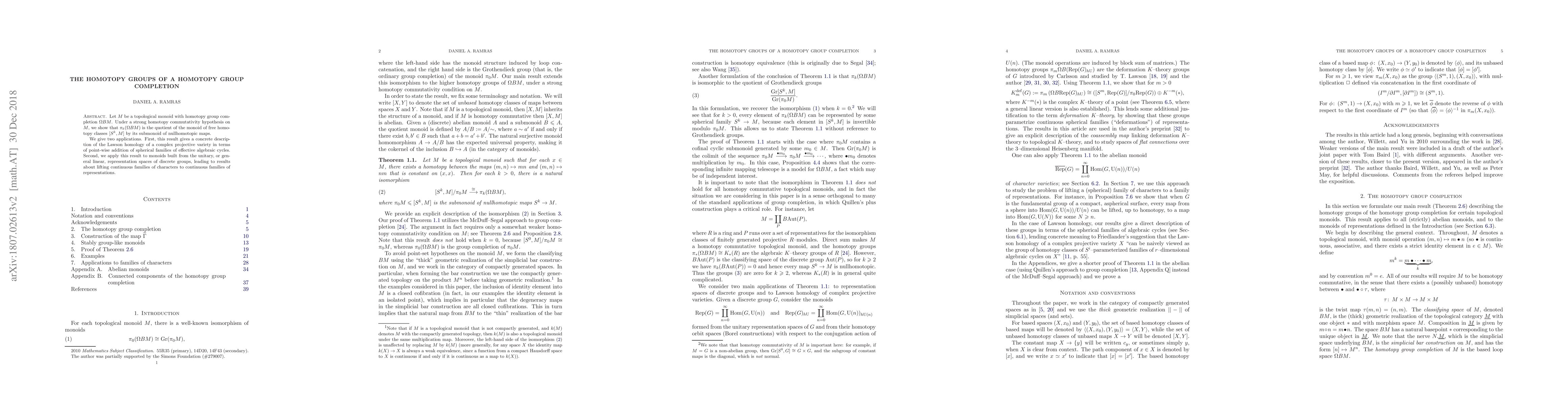 This paper demonstrates that the homotopy groups of the homotopy group completion of a strongly homotopy commutative topological monoid $M$ are determined by the quotient of free homotopy classes $[S^k, M]$ by nullhomotopic maps. It applies this result to describe Lawson homology of complex projective varieties and to lift continuous families of characters to representations in monoids derived from unitary or general linear groups.
