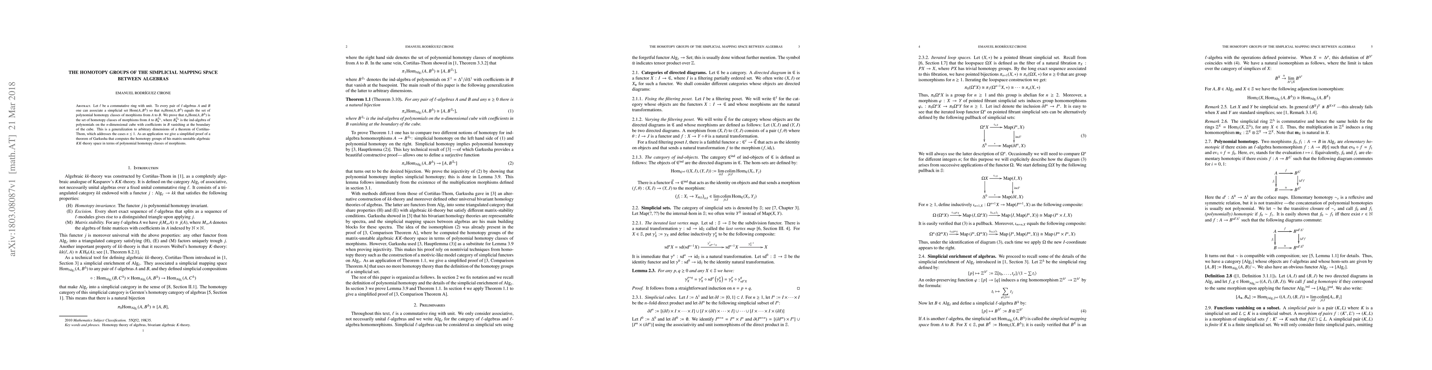 Let $\ell$ be a commutative ring with unit. To every pair of $\ell$-algebras $A$ and $B$ one can associate a simplicial set $\hom(A,B^\Delta)$ so that $\pi_0\hom(A,B^\Delta)$ equals the set of polynomial homotopy classes of morphisms from $A$ to $B$. We prove that $\pi_n\hom(A,B^\Delta)$ is the set of homotopy classes of morphisms from $A$ to $B^{S_n}$, where $B^{S_n}$ is the ind-algebra of polynomials on the $n$-dimensional cube with coefficients in $B$ vanishing at the boundary of the cube. This is a generalization to arbitrary dimensions of a theorem of Corti\~nas-Thom, which addresses the cases $n\leq 1$. As an application we give a simplified proof of a theorem of Garkusha that computes the homotopy groups of his matrix-unstable algebraic KK-theory space in terms of polynomial homotopy classes of morphisms.