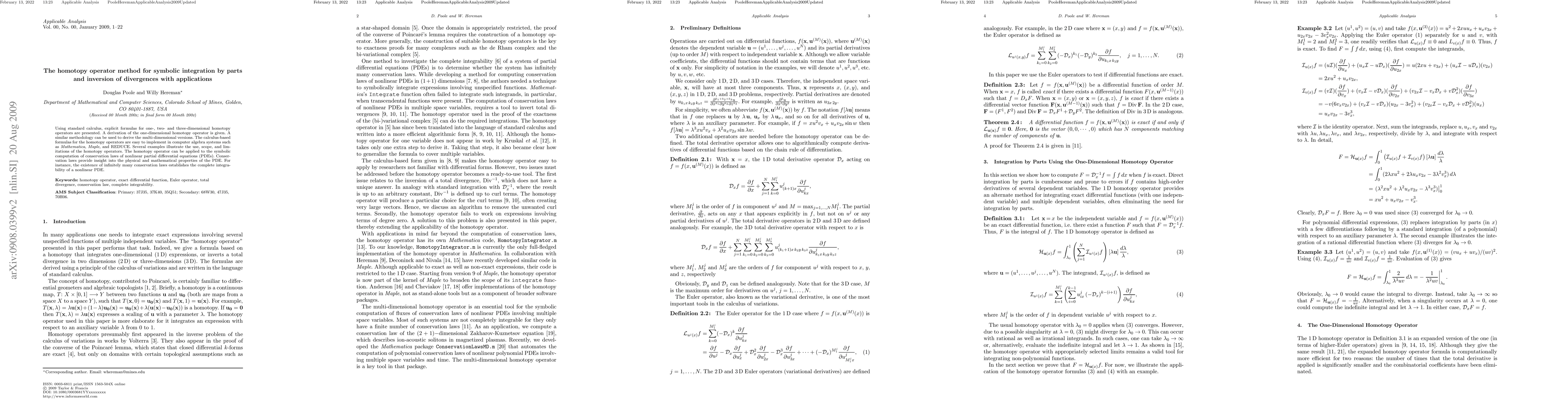 Using standard calculus, explicit formulas for one-, two- and three-dimensional homotopy operators are presented. A derivation of the one-dimensional homotopy operator is given. A similar methodology can be used to derive the multi-dimensional versions. The calculus-based formulas for the homotopy operators are easy to implement in computer algebra systems such as Mathematica, Maple, and REDUCE. Several examples illustrate the use, scope, and limitations of the homotopy operators. The homotopy operator can be applied to the symbolic computation of conservation laws of nonlinear partial differential equations (PDEs). Conservation laws provide insight into the physical and mathematical properties of the PDE. For instance, the existence of infinitely many conservation laws establishes the complete integrability of a nonlinear PDE.