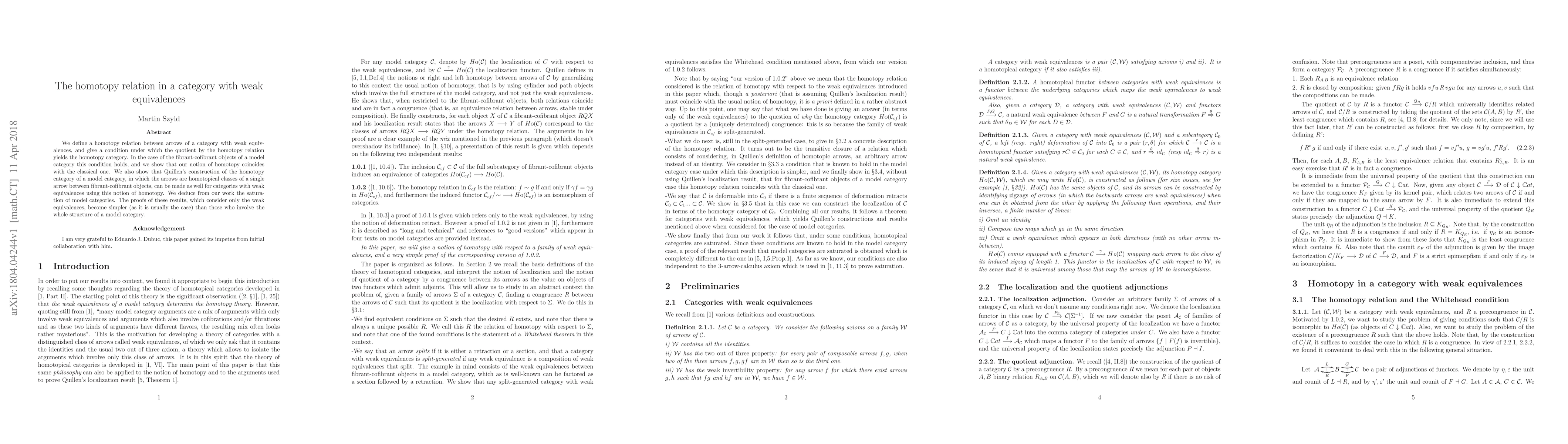 This paper defines a homotopy relation in categories with weak equivalences and shows that it yields the homotopy category under certain conditions. It demonstrates that this approach simplifies proofs and aligns with Quillen's construction for model categories.